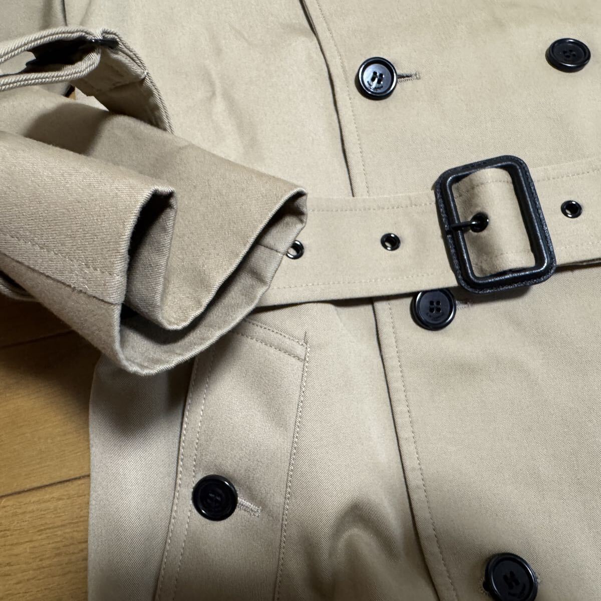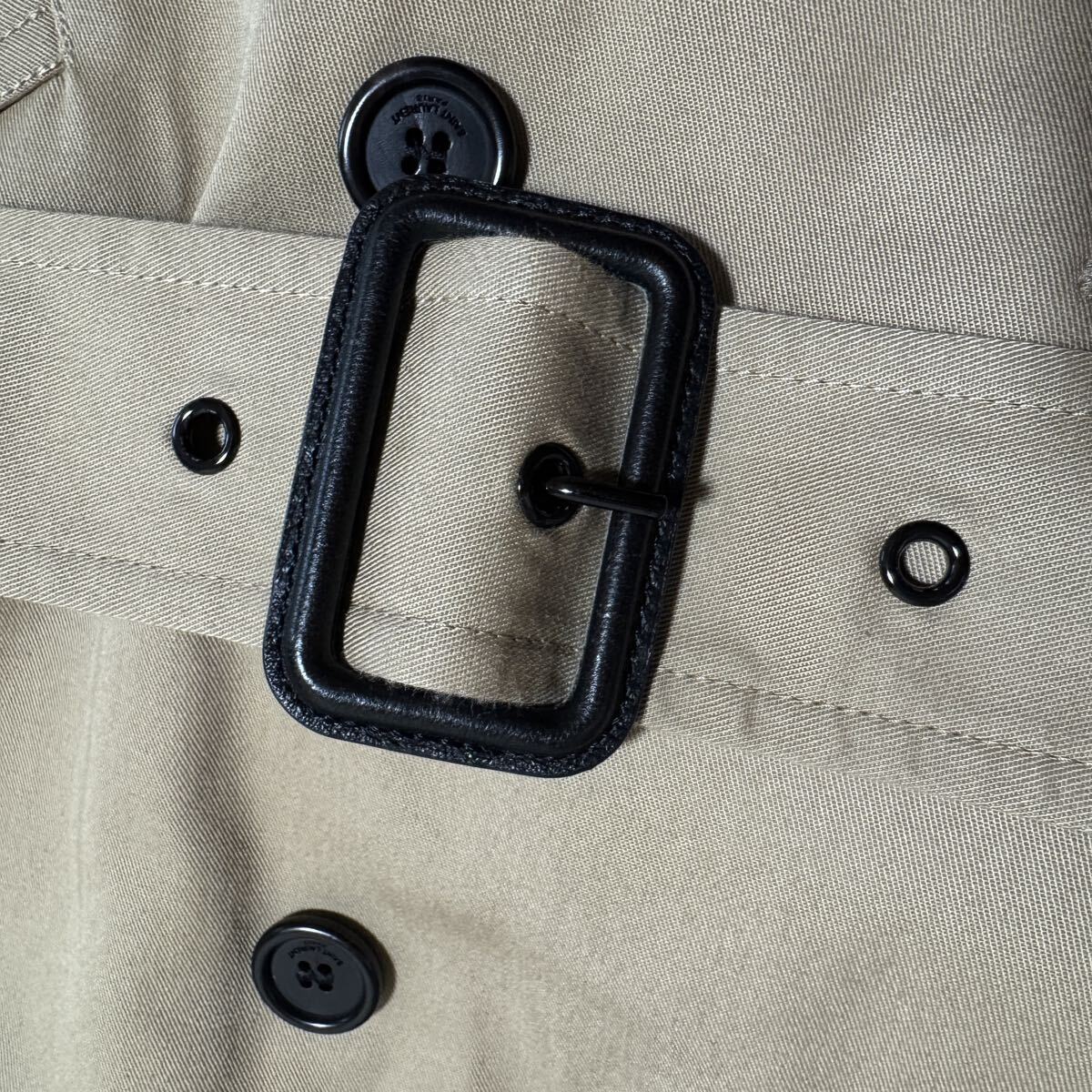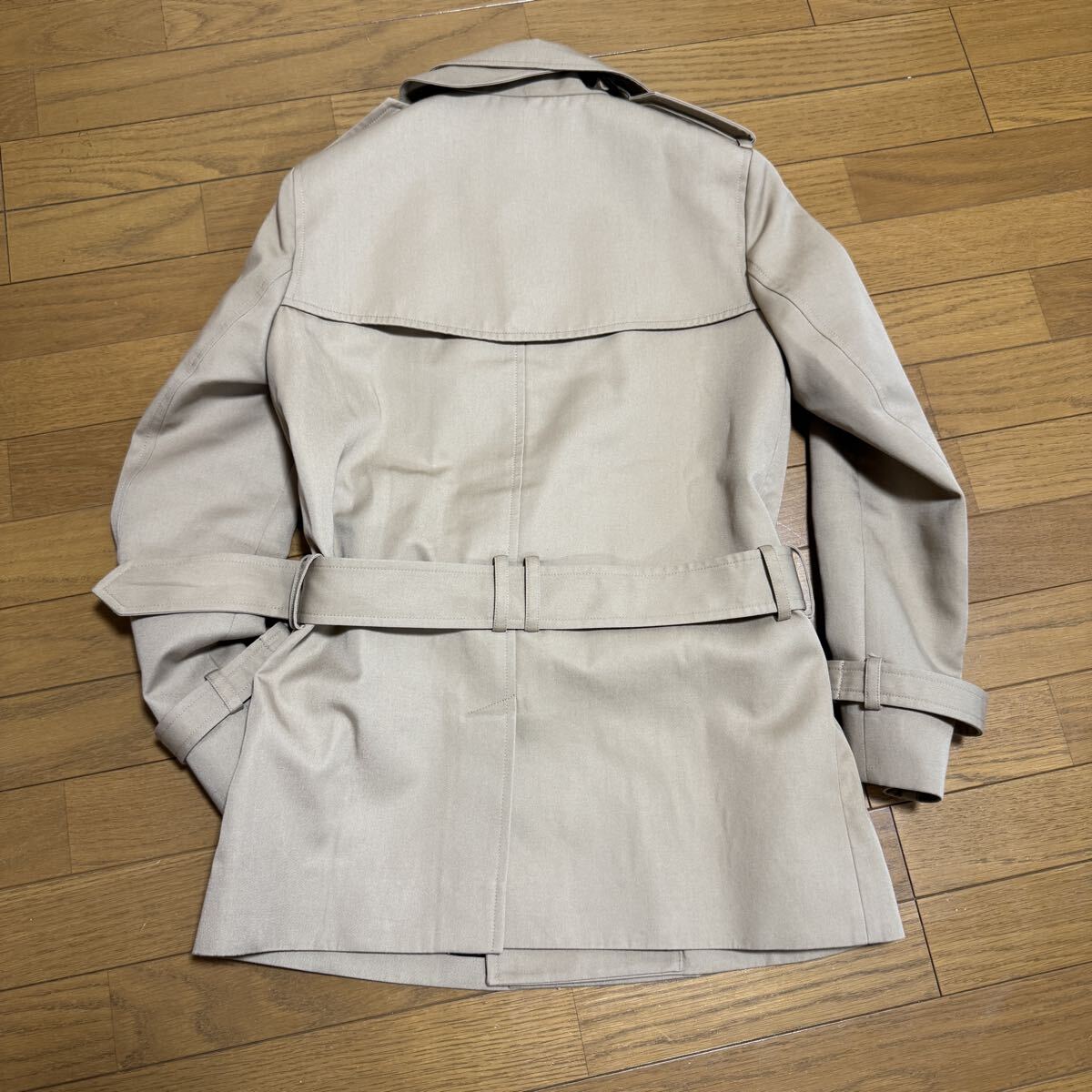 SaintLaurentParisサンローランパリのトレンチコートです。張り感のあるコットン混ギャバジン素材、サンローランらしいコンパクトなおつくりがとても格好良いです。裏地付きですので秋冬から春先まで活躍します。ショート丈(ひざ上丈)のベージュトレンチコートは、スカートにもパンツにも合わせやすくジャケット感覚で羽織れるためとても重宝しました。3・4回使用してクリーニング済。目立った汚れ・傷みはありませんが、USED自宅保管が気になる方はご遠慮ください。