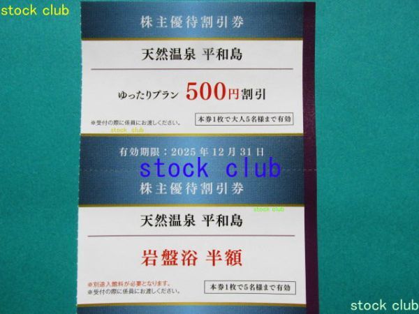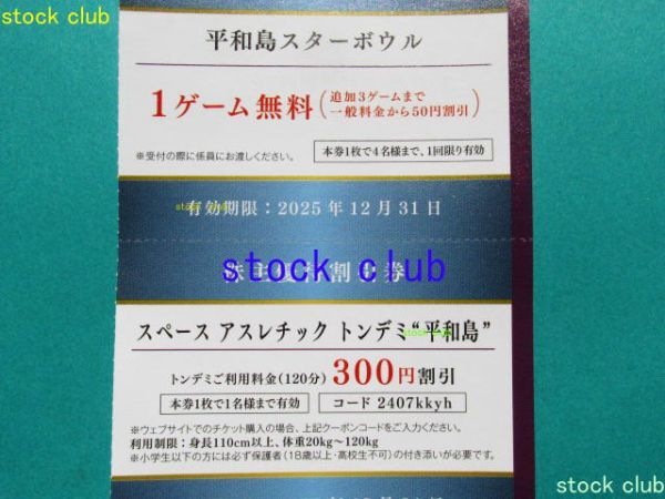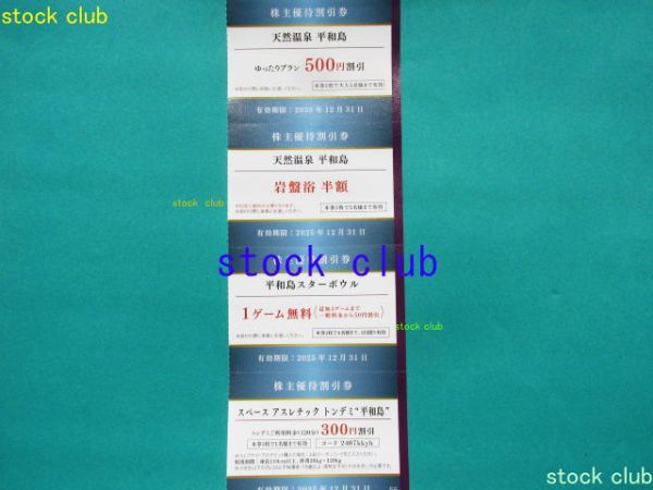 京浜急行電鉄主優待の株主優待券天然温泉平和島500円割引1枚と岩盤浴半額券1枚、平和島スターボウル1ゲーム無料券1枚、トンデミ300円割引券1枚 計4枚です。