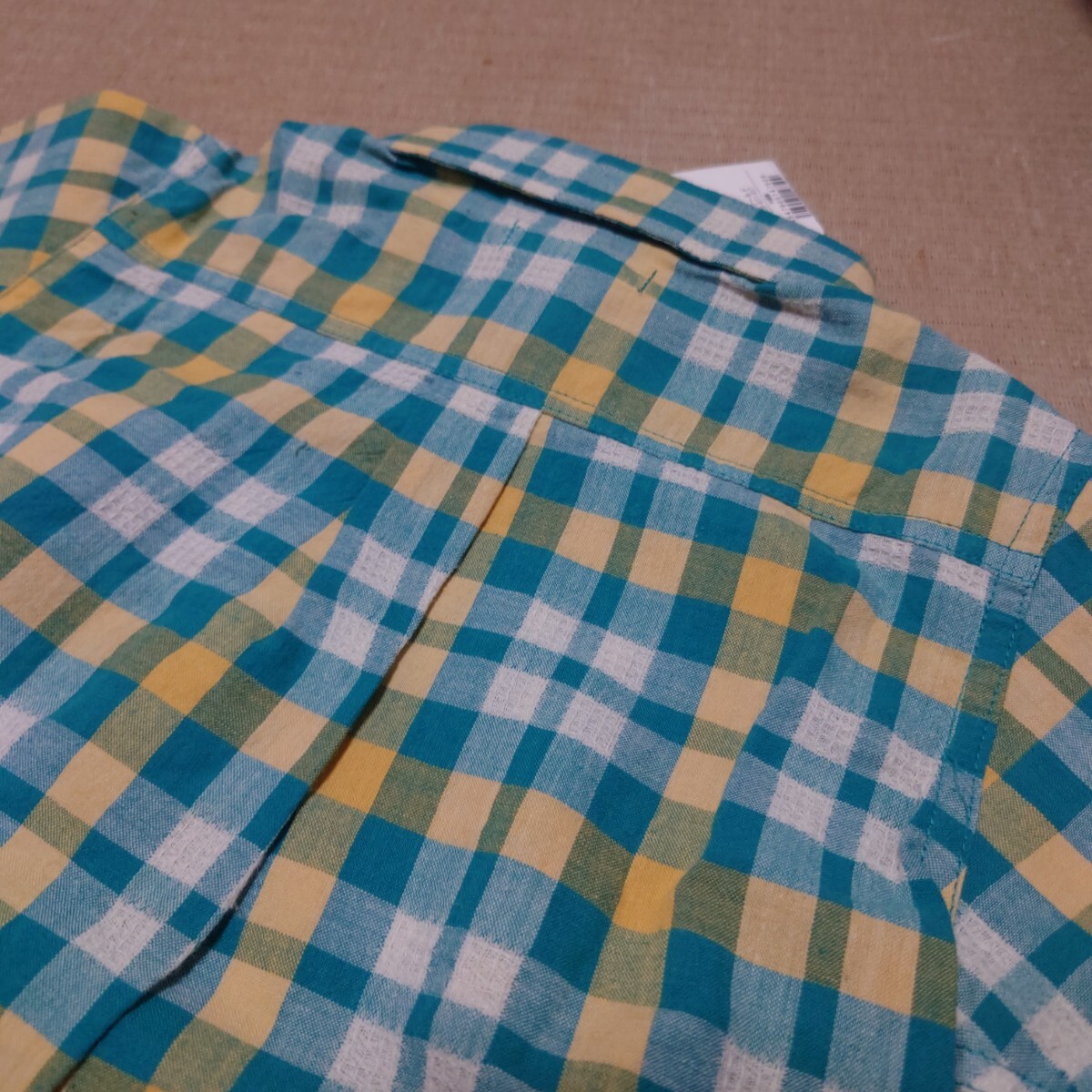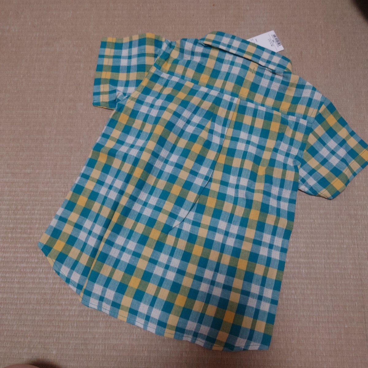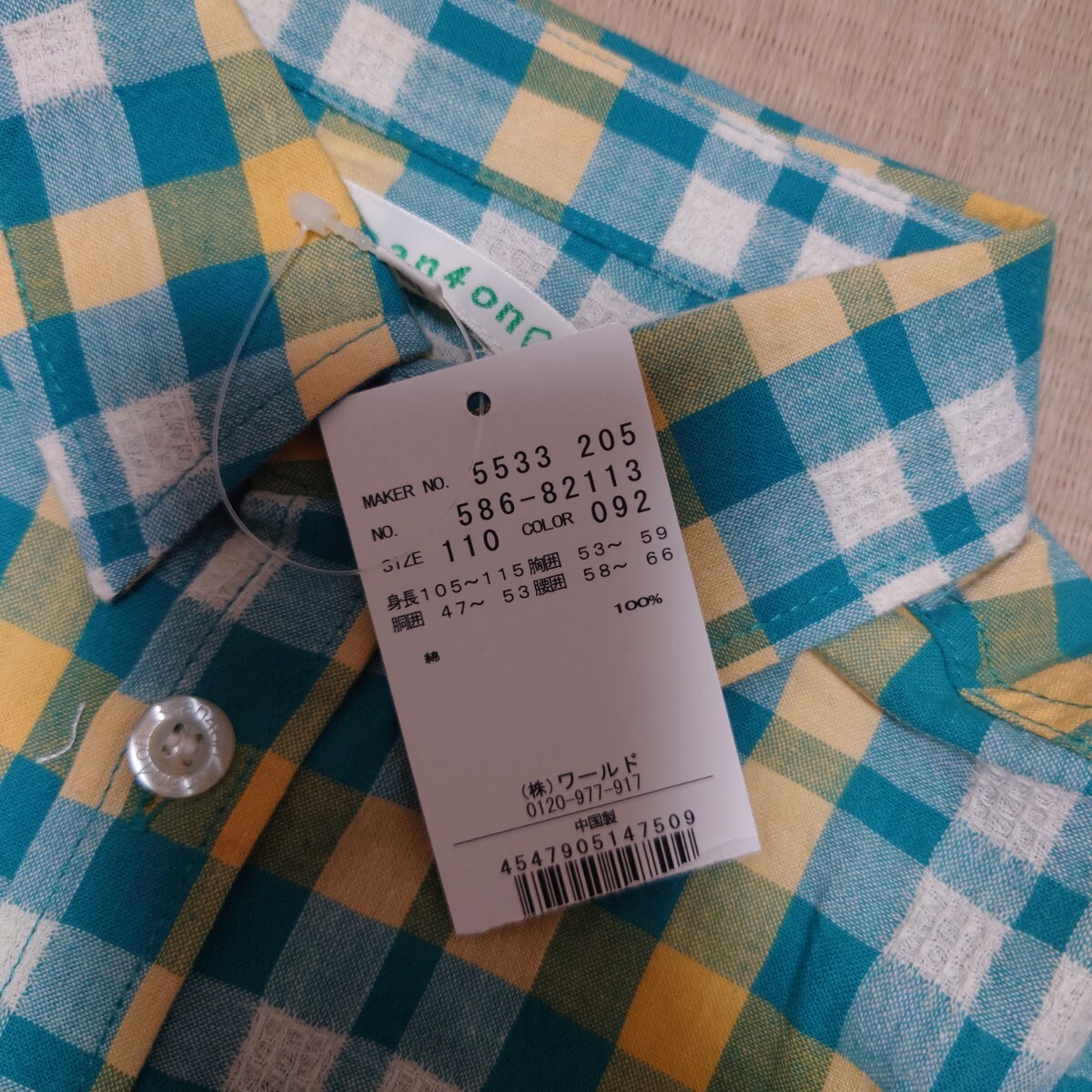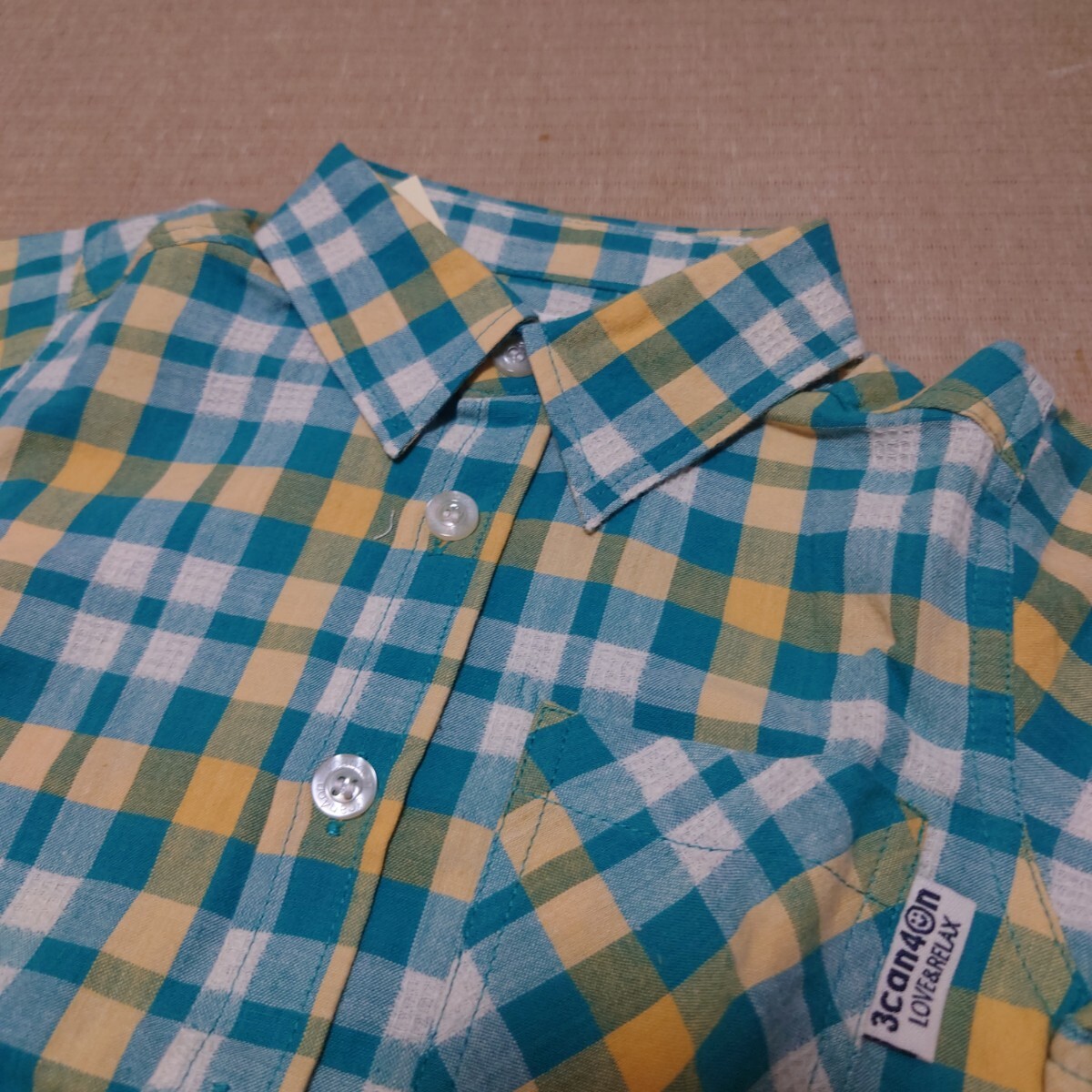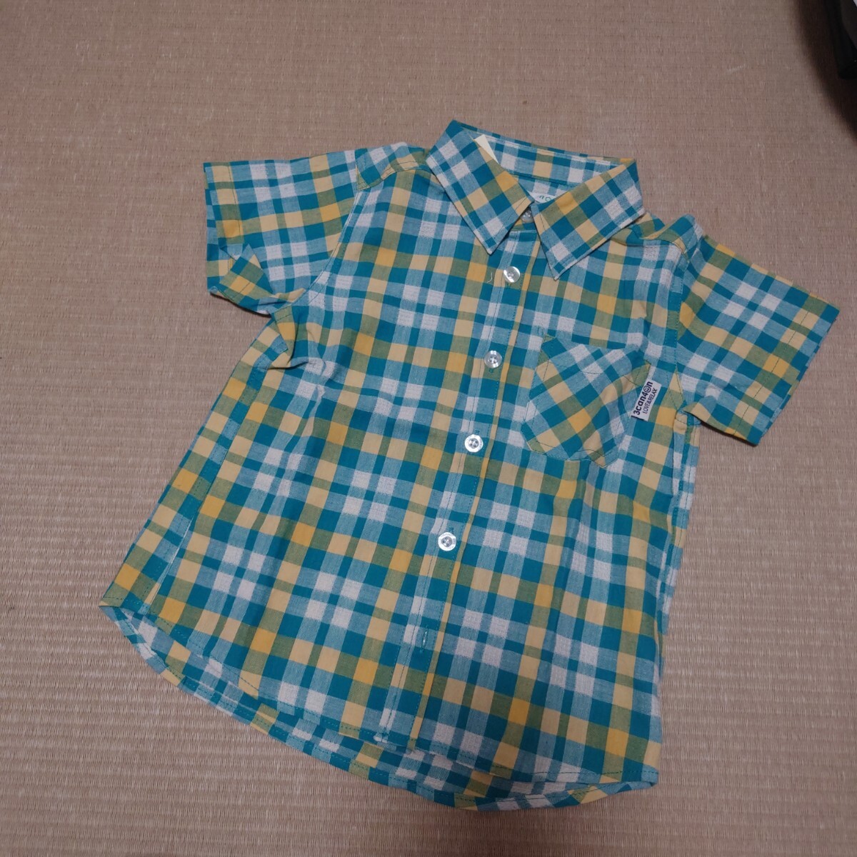 青・黄・白のチェック柄の半袖シャツ、110cmサイズ、100%コットン製。