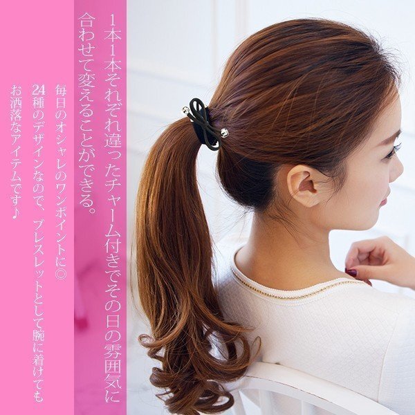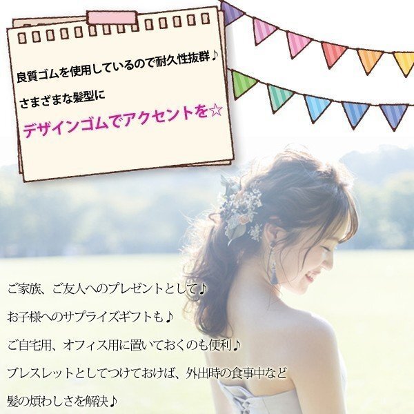 その日の気分やコーデに合わせてチョイス! 学校や職場などでも使える、カワイイ髪ゴムの大量セット! 1本1本それぞれ違ったチャーム付きで、その日の雰囲気に 合わせてお好きなデザインを選べちゃう。 良質ゴムを使用しているので耐久性も抜群♪ さまざまな髪型にデザインゴムでアクセントを☆ 毎日のオシャレのワンポイントに◎ ブレスレットとして腕に着けてもお洒落なアイテムです。 常に身に着けておけば、外出時の食事中など、 髪の煩わしさが気になるときにサッとまとめられますね♪ 筆記用具やペンをデザインゴムでまとめてみるのも◎ トランプやカード類をコンパクトに納められます♪ ご家族、ご友人へのプレゼントとして・・・ お子様へのサプライズギフトも・・・ ご自宅用、オフィス用に置いておくのも便利! |