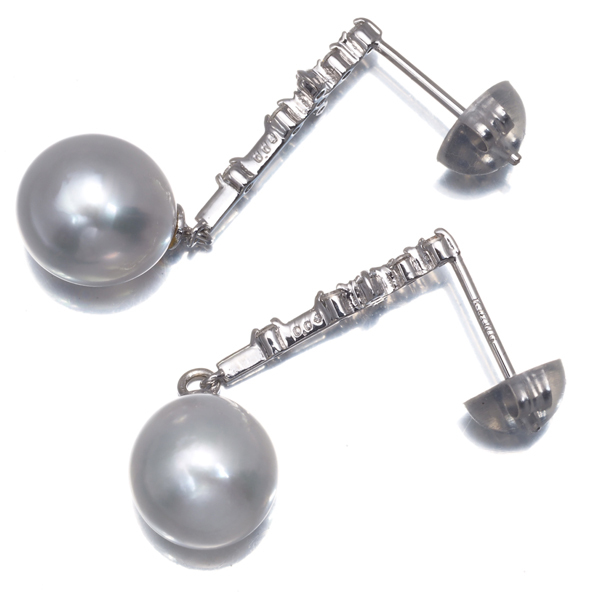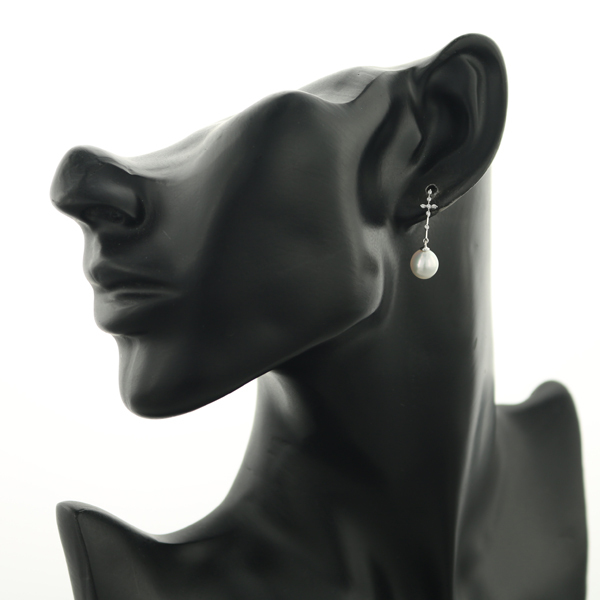 ステーションに煌めくメレダイヤの繊細な煌めき下部へ艶やかな光沢と仄かなピンクの彩浮かべるアコヤ真珠の揺れ煌めきを飾ったピアスです。 |