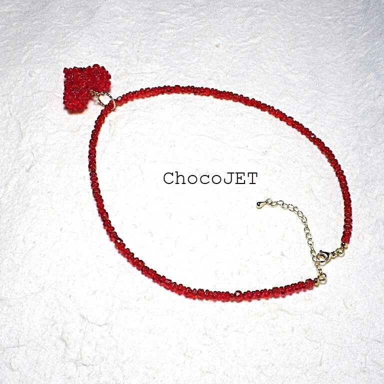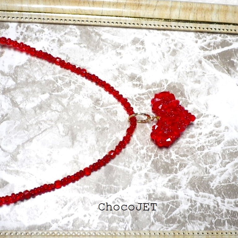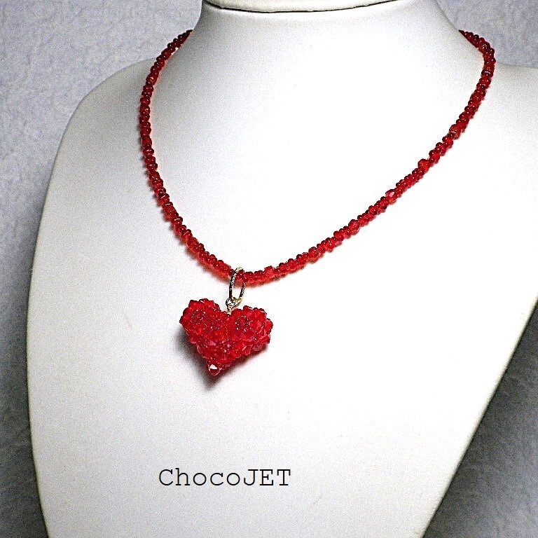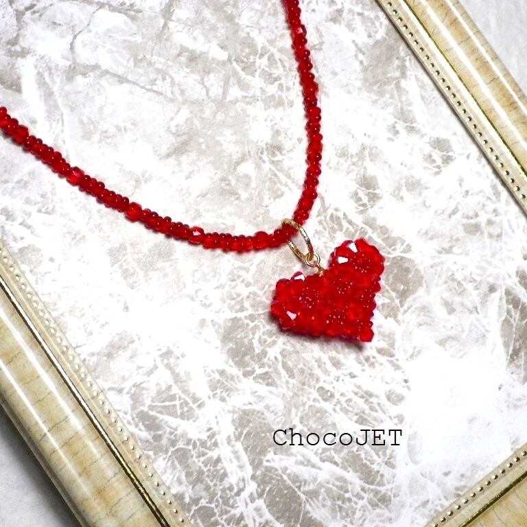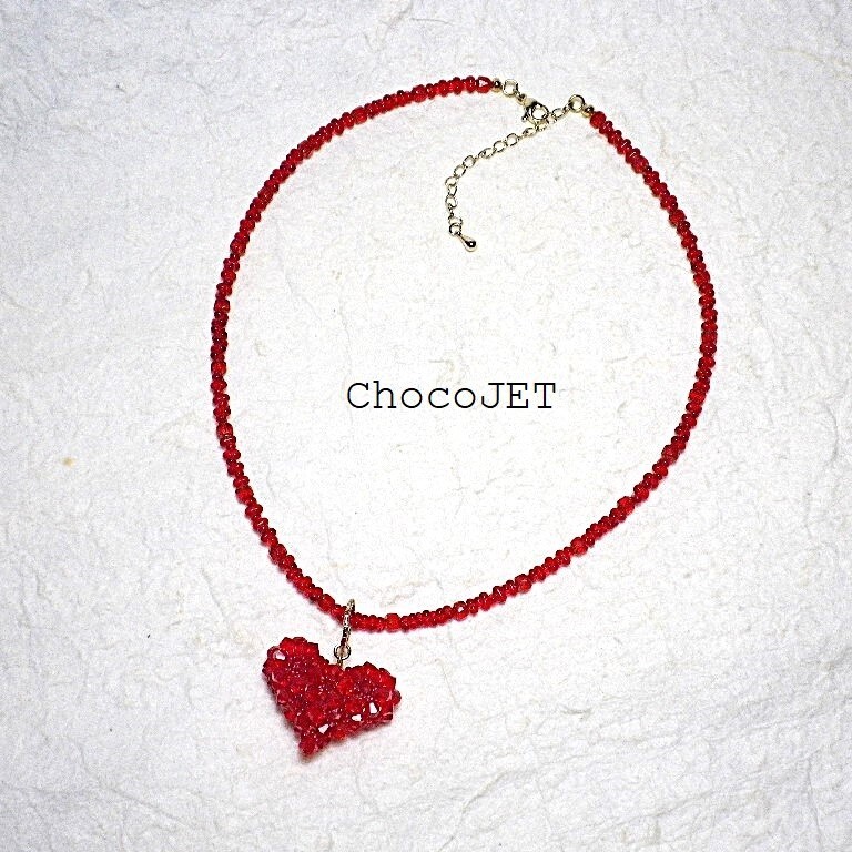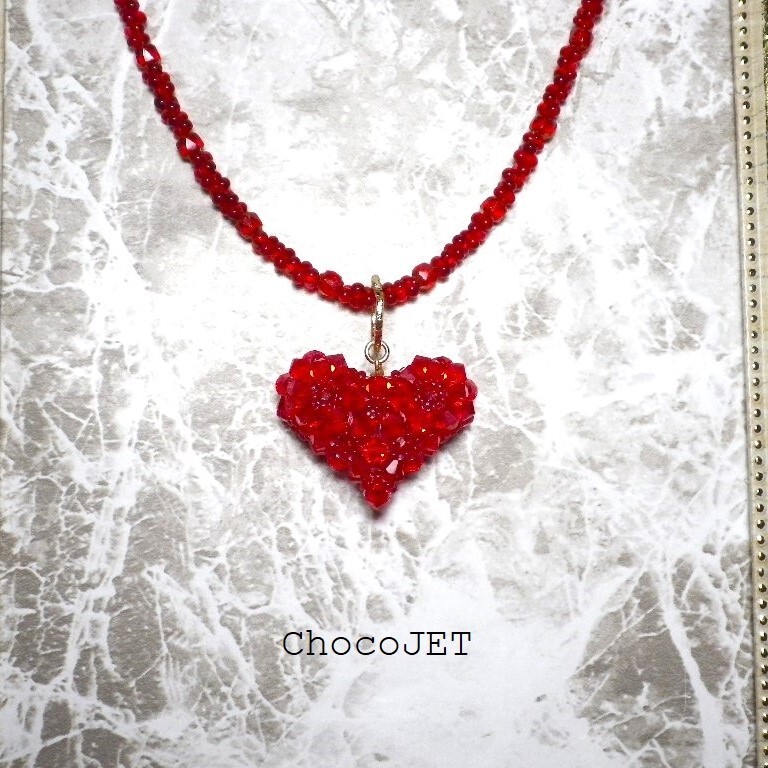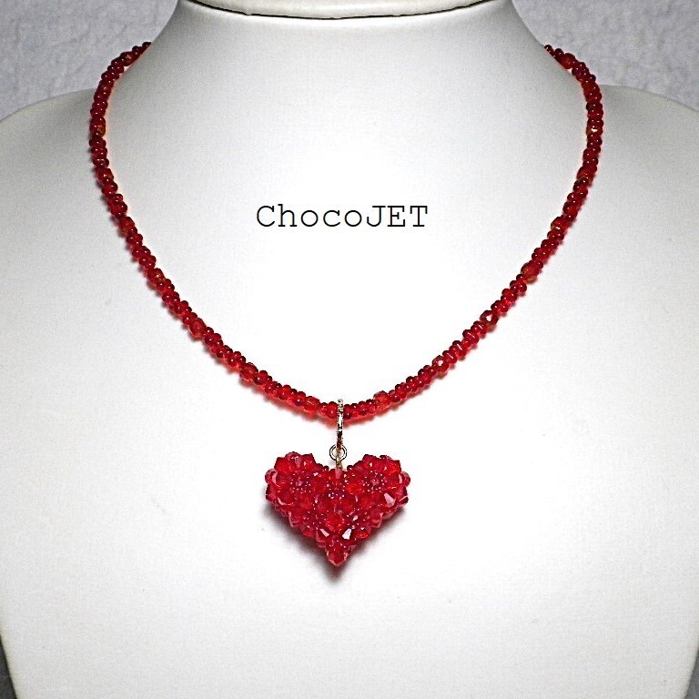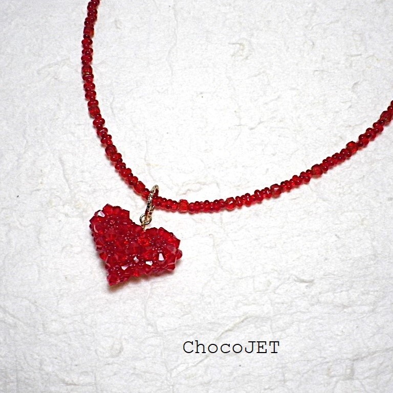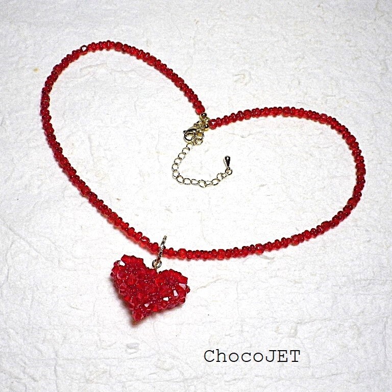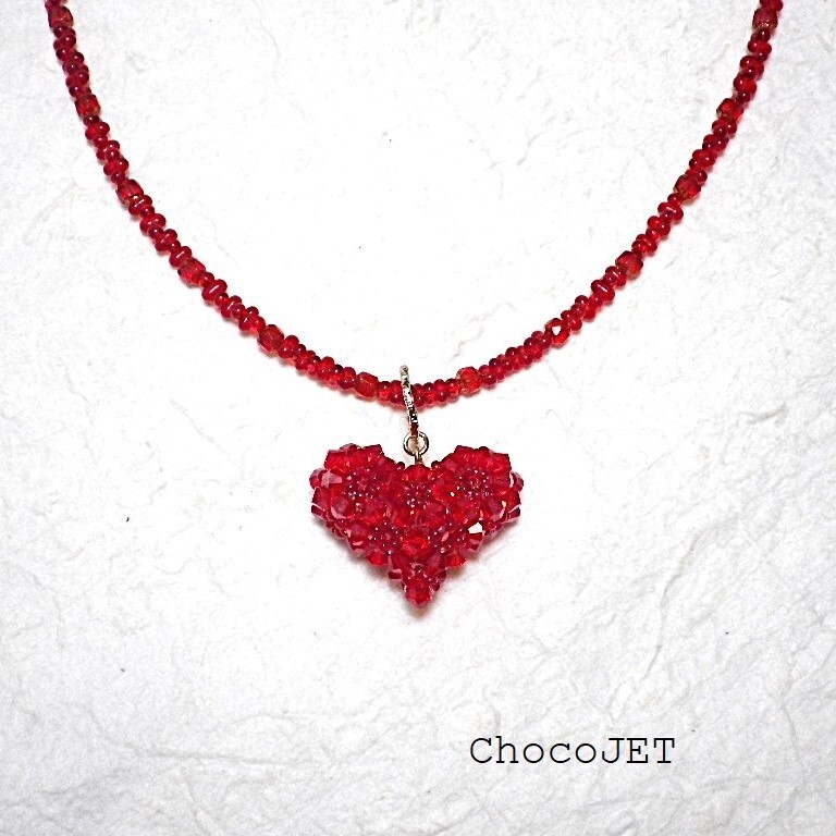 クリスタル・スワロフスキービーズとシードビーズで製作したふっくらハートのキラキラと輝くハートモチーフのネックレスです。