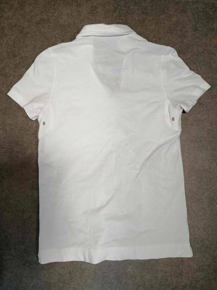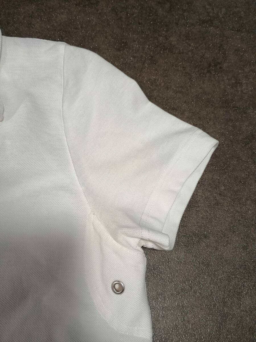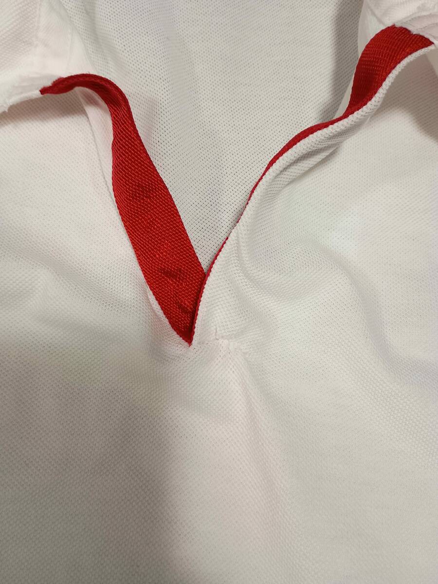 清潔感のあるホワイトの生地に、襟元のレッドラインがさりげなく映え、シンプルながらも洗練された印象を与えます