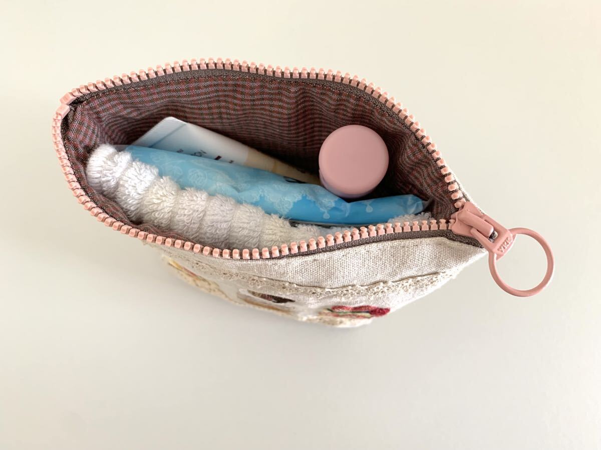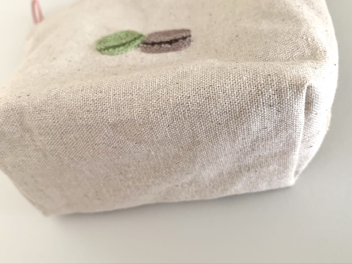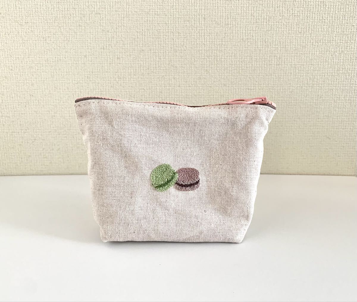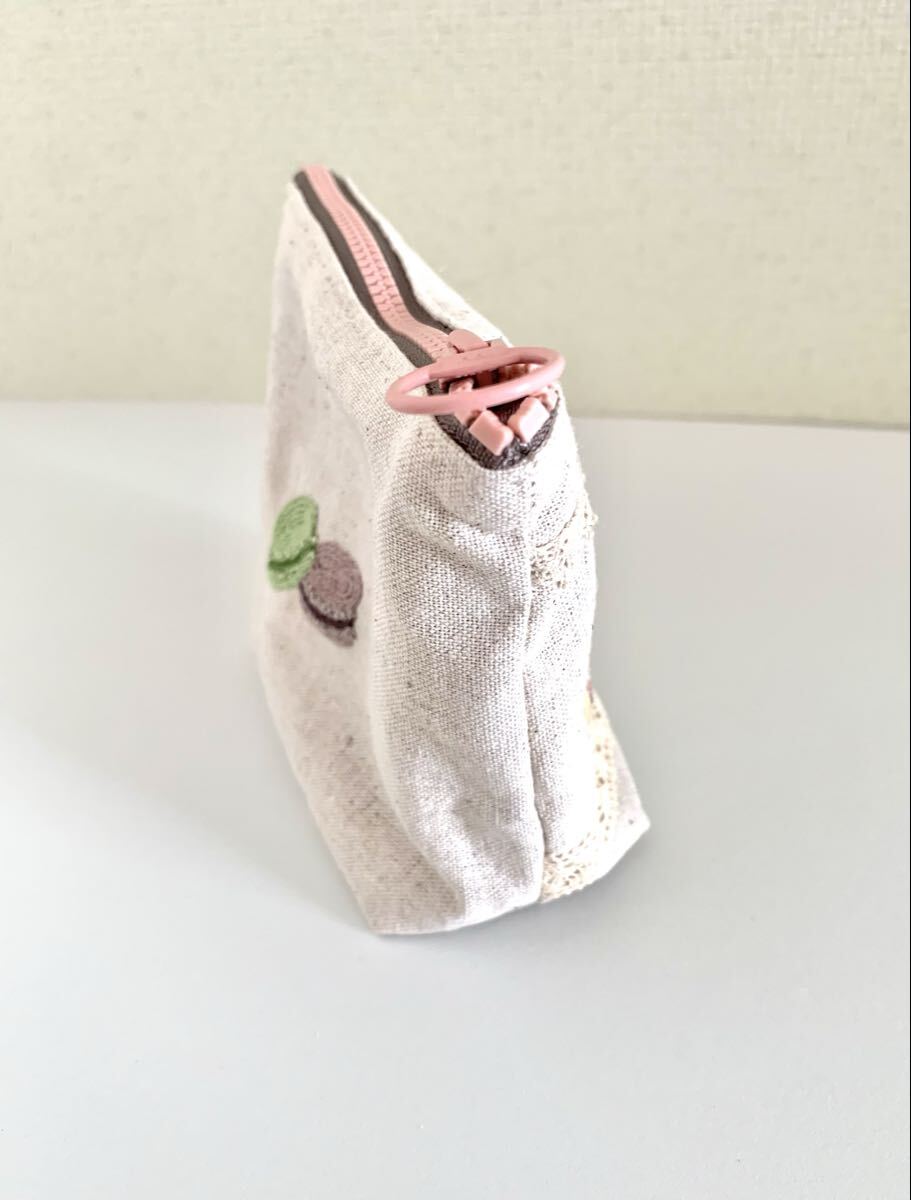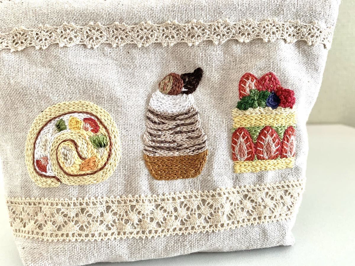 生成りのコットンリネンにモンブランやトライフルロール、フレジエ、裏面にはマカロンのスイーツの手刺繍を施してファスナーポーチに仕立てました。