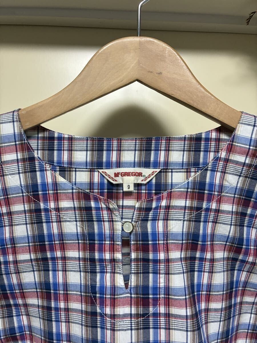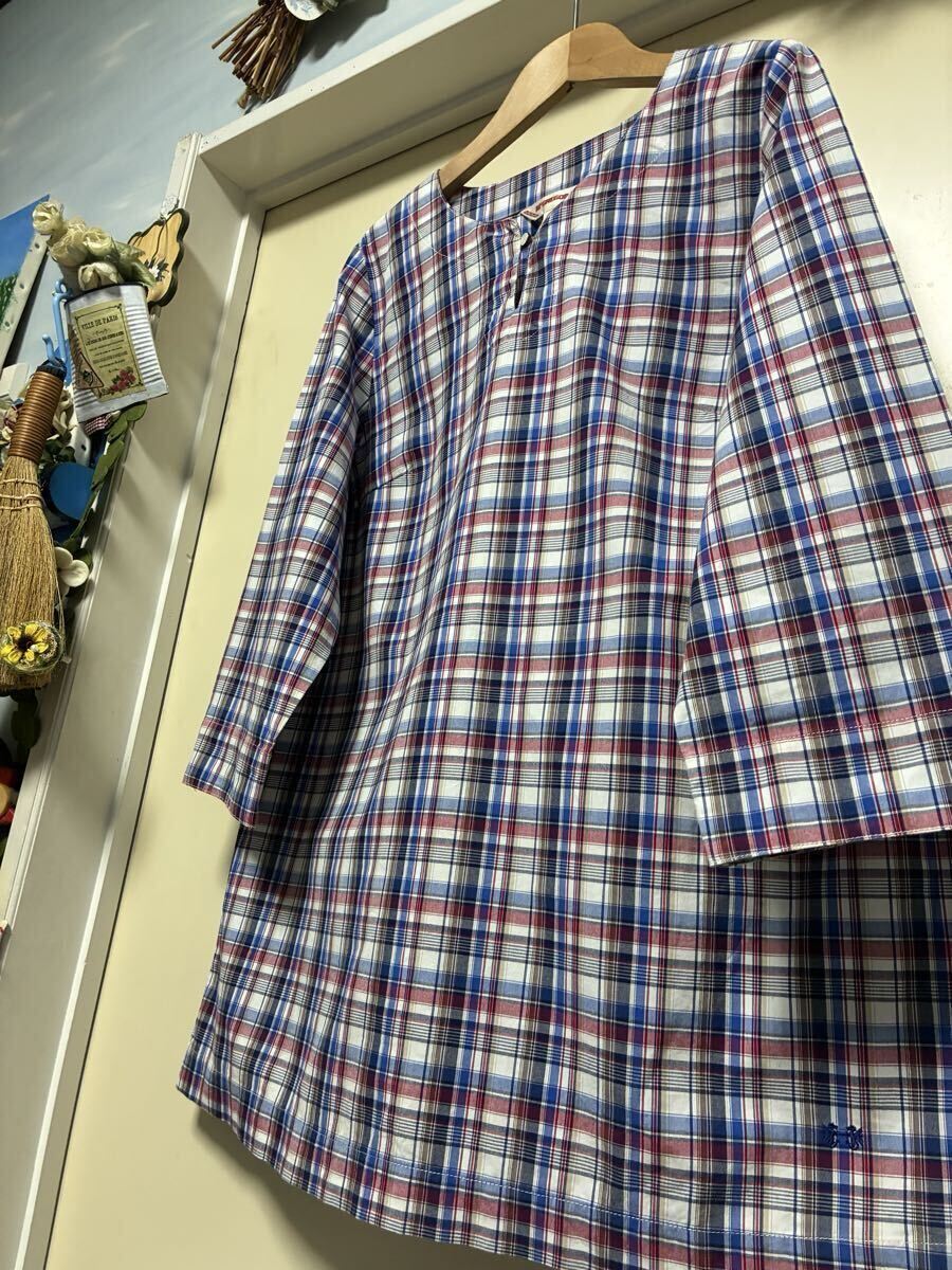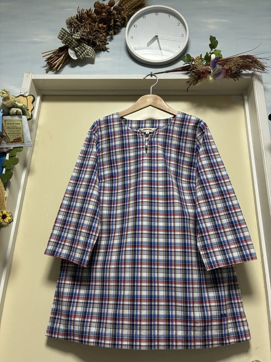 ★MC.GREGOR★お洒落な色合いのチェック柄でコットン100%のチュニック丈ブラウスになります。レッド×ブルー×ホワイト×ライトブラウン系のお洒落チェック柄で前中心はスリット入り1ボタンになっています。お袖も揺ったりとしていて袖口はスリット入り1ボタンになっています。とてもシンプルながらお洒落な一枚に仕上がっています。