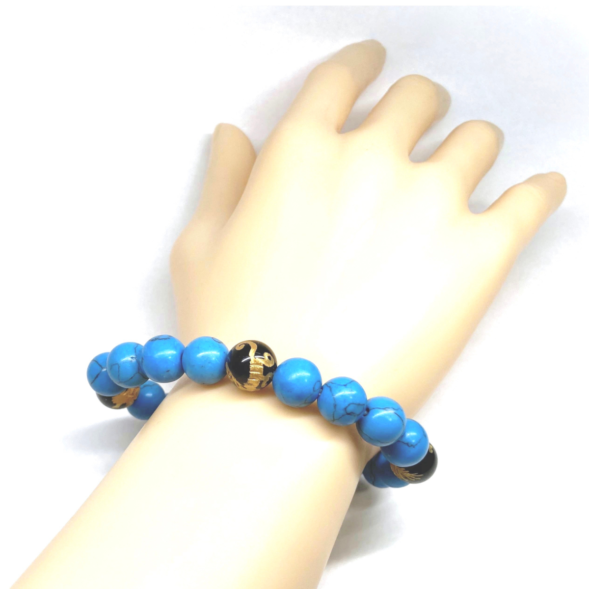 こちらは、四神獣金彫オニキスとターコイズを組み合わせたパワーストーンブレスレットです。四神獣は、中国の伝説で4つの方向(東西南北)を守護する神聖な神。四神獣、厄災から身を守り、多くの運気を呼び込むと言われております。石大きさは程よくインパクトのある10mm玉で内周 約17cmです。 数に限りがございますので気になる方はお早めにどうぞ。