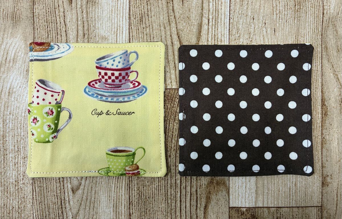 ティーセットをモチーフにしたプリント生地でコースターを作りました。