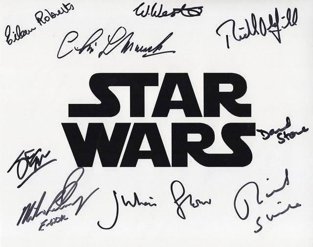 『スターウォーズ』シリーズに出演のキャスト9名、ジュリアン・グローヴァー、マイケル・ヘンブリー、アイリーン・ロバーツ、リチャード・ストライド、デヴィッド・ストーン、ビル・ウェストベリー、リチャード・オールドフィールド、ジョン・コッピンジャー、クリストファー・ムンケ(Julian Glover, Michael Henbury, Eileen Roberts, Richard Stride, David Stone, Bill Westbury, Richard Oldfield, John Coppinger and Christopher Muncke)の直筆サイン入り写真です。 | |