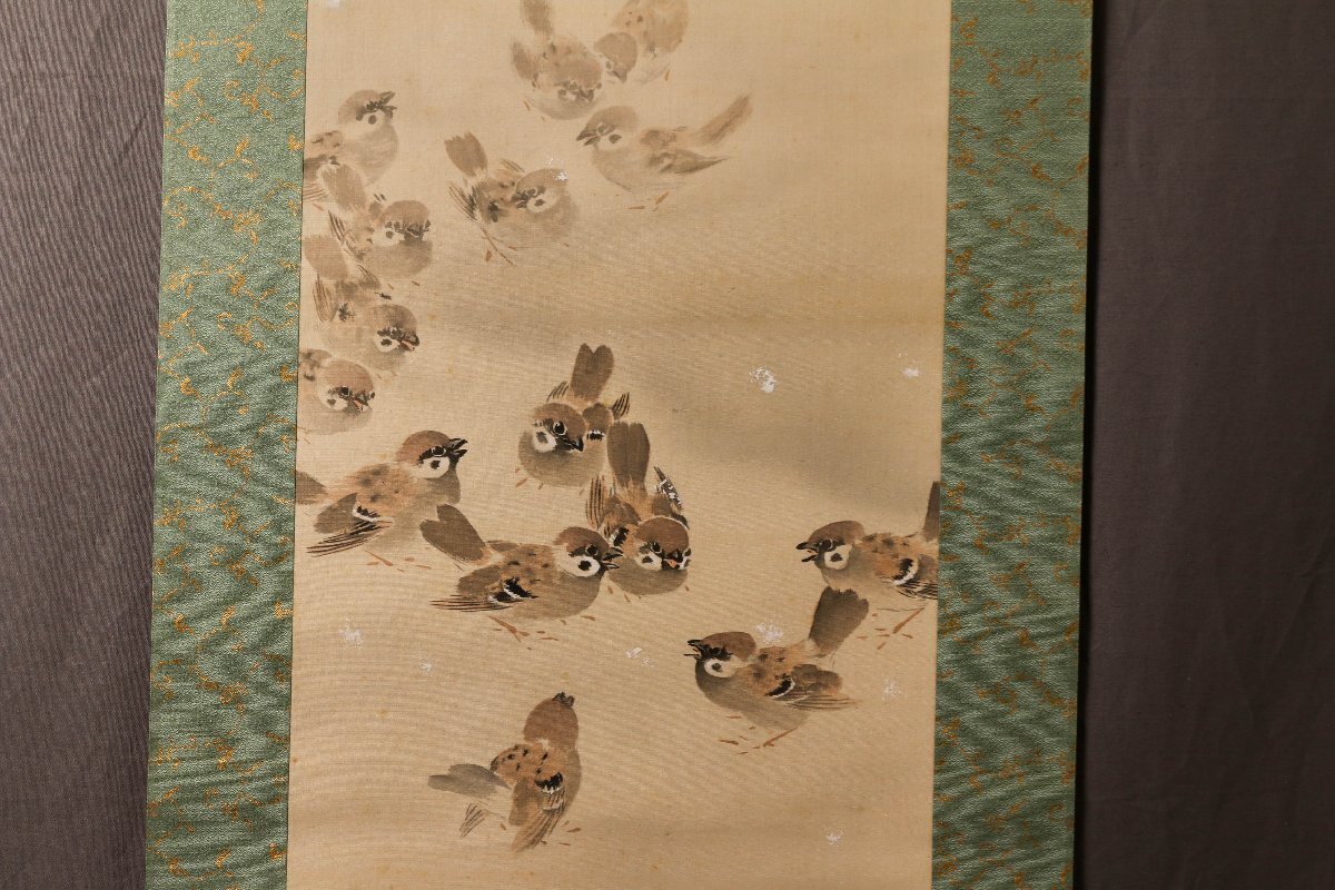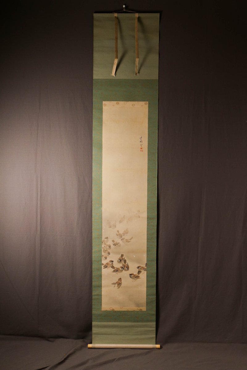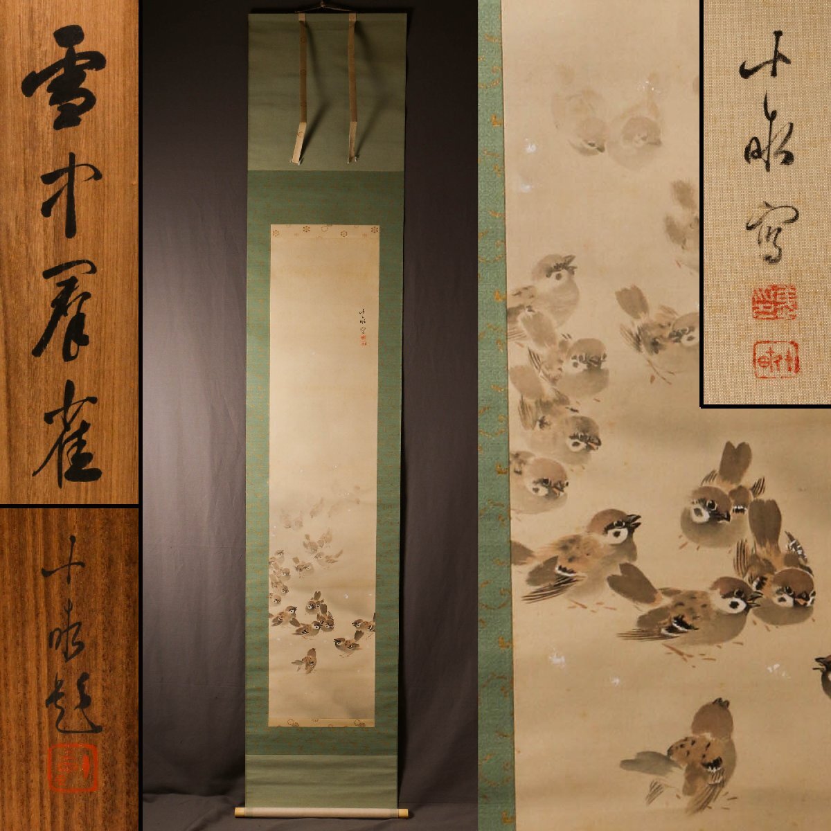 【佳香】荒木十畝 『雪中群雀図』 肉筆 絹本 掛軸 共箱 二重箱 本物保証