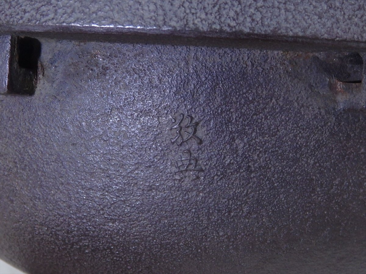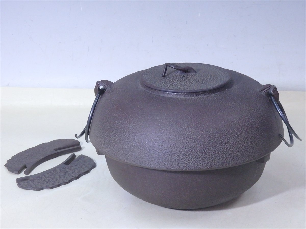 【管理番号5-1001013-12 スタッフコメント:iy】  釜本体の胴径26.5cm 高さ19.5cm 銀ツマミの蓋の直径12.5cm  ☆茶の湯釜の形状のひとつで、裏熬、裏合、裏靠とも書きます。蓋は銅製で摘まみは南鐐(銀)、透木2本、釜鐶、鉄製の替蓋も付属しております。内側は若干サビがありますが、水漏れはしません。銅蓋のふちは、若干擦れあり。共箱入り、作家の栞付きです。