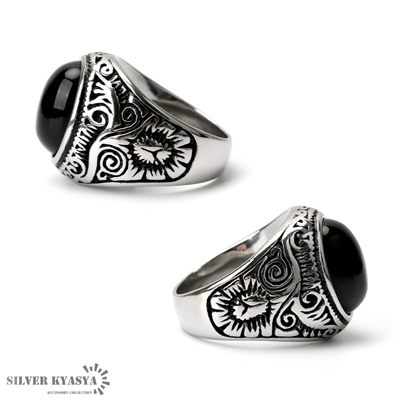迫力ある特大の漆黒ブラックストーンをセットしたオニキスリング。唐草のレリーフが密度の濃いスタイルを演出。つけ心地の良い滑らかな加工を内側に施してあり、指にぴったりとフィットします。頑丈なステンレスリングなので一生のお供になるアイテムです。プレゼントやギフトとしてもおすすめです。