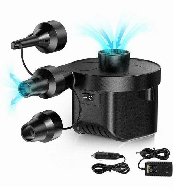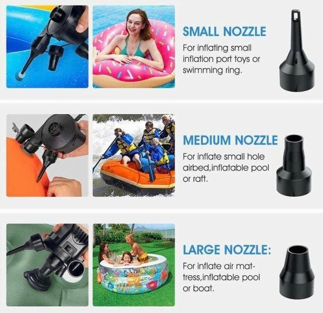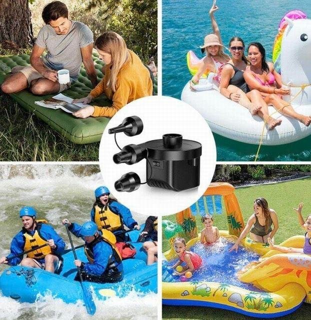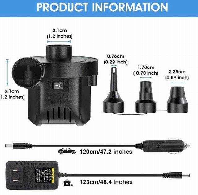 【空気入れ抜き両対応?時間や体力節約】空気入れと空気抜き、一台だけで両方対応できます。電動エアーポンプで空気を入れ、空気を抜くことが出来ます。使い方も簡単、ノズルをホースの口に入れる、ON/OFF ボタンを押すと素早く空気入れと空気抜き出来ます。手動ポンプより時間や体力を節約出来ます 【二つ給電方式?コンパクトで携帯便利】手のひらに収まるサイズで非常にコンパクトどこでも使えるので持ち運びも便利です。本製品はACアダプター給電、シガーソケット給電の二つの給電方式が搭載しており、家庭用のAC100V~240Vまたは車のシガーソケットDC12V(24Vは不可)の電源使用できます。収納には場所が取らず、車の中に置いて必要なときはざっと出せ気軽にお使い頂けます。 【3種類付け替えノズル付き?高い交換性】3種類の付け替えノズルで、用途に合わせてノズルを交換可能、高い交換性を実現!浮き輪はもちろん、大型プールの大口径空気穴などにも対応できます。ビーチボールや浮き輪、ビニールプールの空気入れがとってもラクチンになります。※ご注意:風船、バスケットボール、サッカーボール、自転車には利用できません。 【過熱保護?安心安全設計】浮き輪、ゴムボート、エアベット、ビニールブールなどに適用します。また、布団や衣替えの真空収納にできます。内部には排熱ファンが搭載して、過熱による危険を防ぎます。ご注意:20分以上の連続運行させないでください。長時間動作すると過熱による故障の恐れがあります。