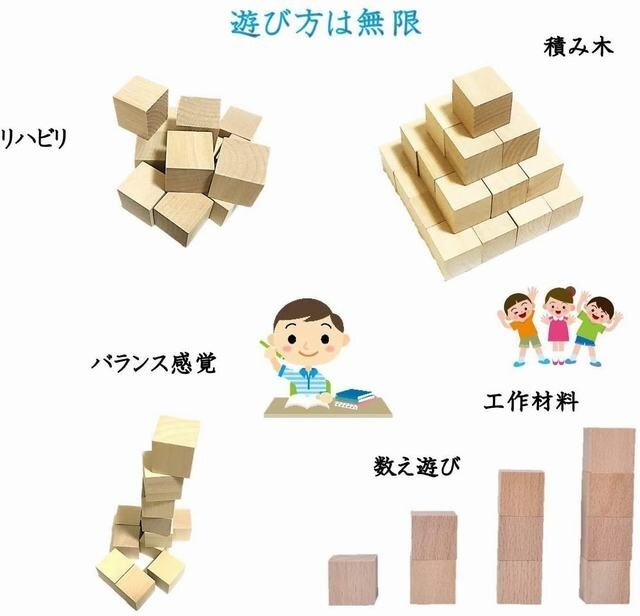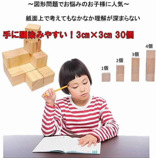 ナチュラルな木製キューブ積み木30個セット! ブロック サイズ:手に取りやすい 3cm×3cm ブロック30個セット お子様の図形問題で大変喜ばれております。 紙で説明しても伝わらない,実際の図形なら理解した経験は御座いませんか。 知育のファーストステップに!教材や工作の材料に! 小学校受験 中学受験の積み木問題対策に是非ご利用ください。 小さいブロックなのでお子様が口の中に入れてしまわないよう十分ご注意して下さい。対象は6歳以上のお子様から