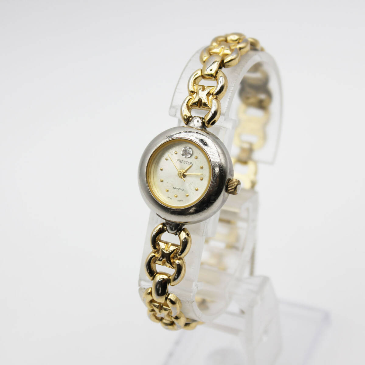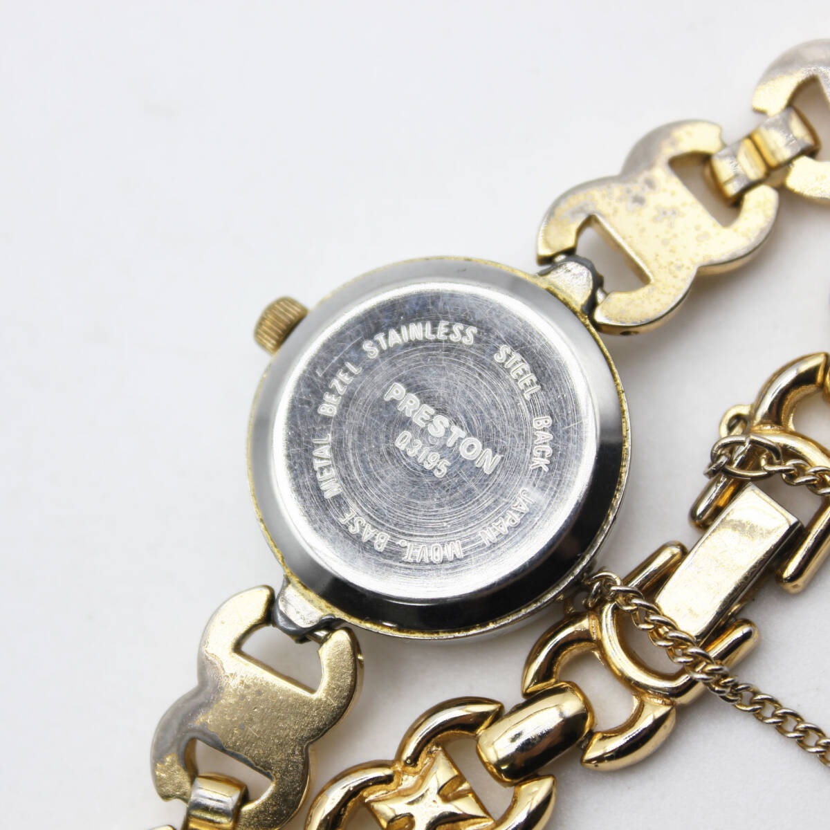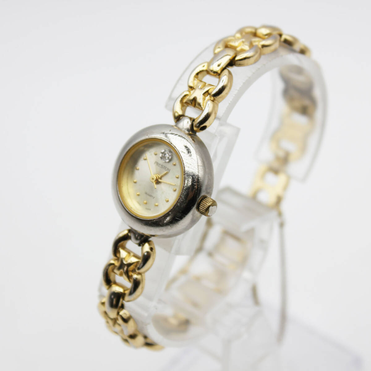 W251009-48 PRESTON プレストン Q3195 レディース腕時計 クォーツ ジャンク 文字盤ゴールド 石付き ラウンド ブレスレットウォッチ