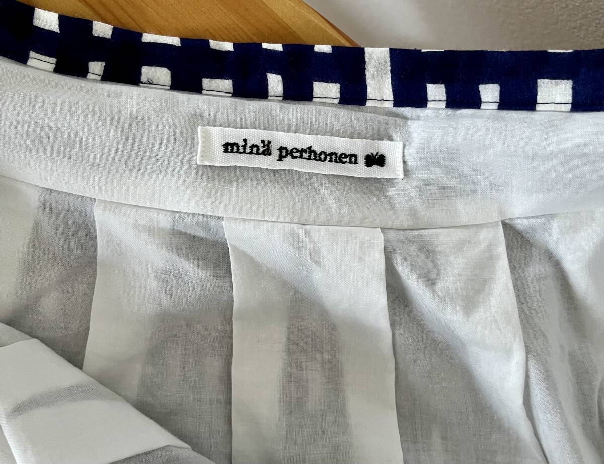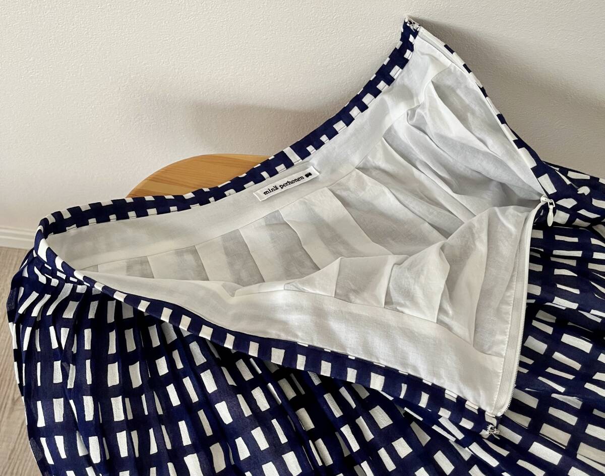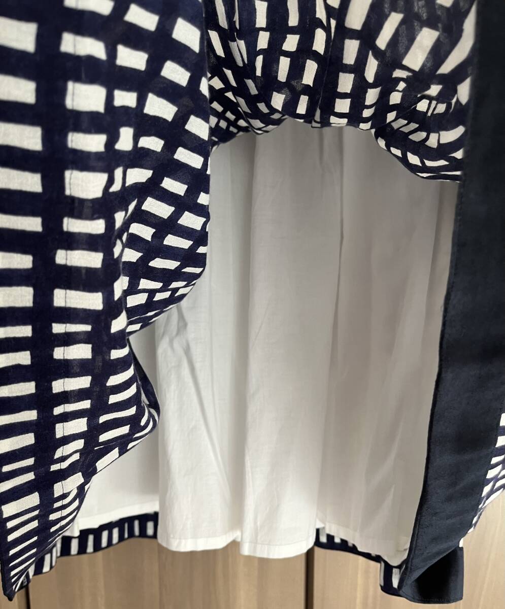 ふんわりとした透け感のあるコットンボイルオーガンジーの様な生地のネイビーブルーと白のチェック柄テキスタイルのスカート。