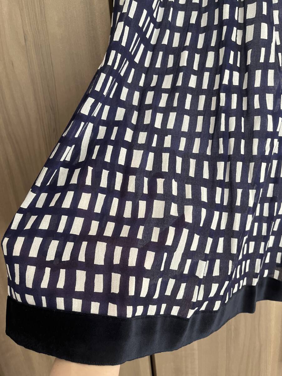 裾にネイビーカラーの別珍素材のリボンでぐるりとトリミングがあり、ふんわりした生地に綺麗な落ち感を与えています。デザインにも良いアクセントになっていて素敵なポイントです。