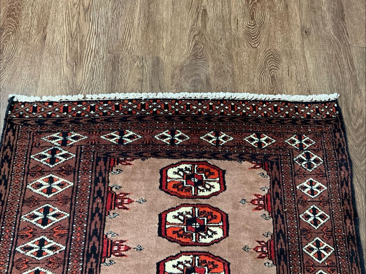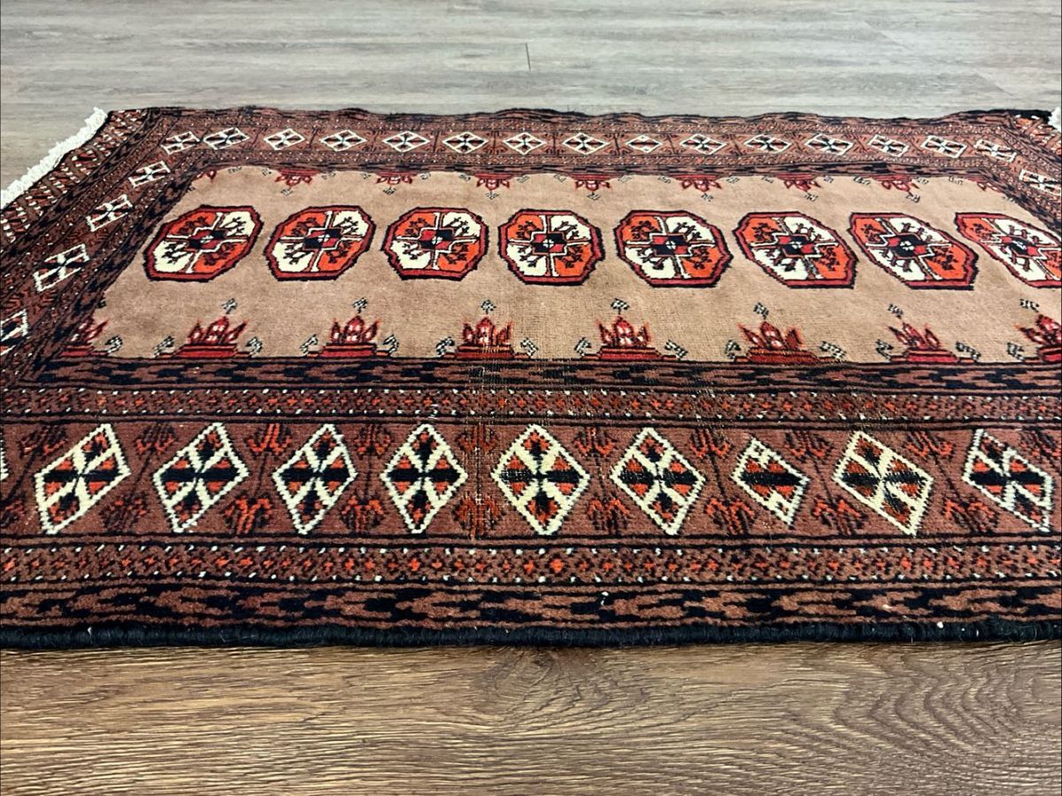 ★カフェモカ★中央左側に経年による擦れが広がっております。手織りの味わいを感じる細かく目の詰まった丈夫な織り、短く揃えられたきめ細かく滑らかな手触りの毛並み、落ち着いたモカブラウンのフィールドには伝統的なボハラのモチーフが並び、ラホール産ラグならではの絶妙な配色がオススメの一枚です。(画像をご確認下さい。)