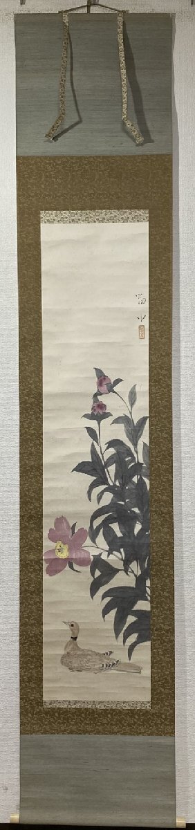 紙本半切、29×129㎝、淡彩花に鳩図、印一、緞子三段装、共箱。