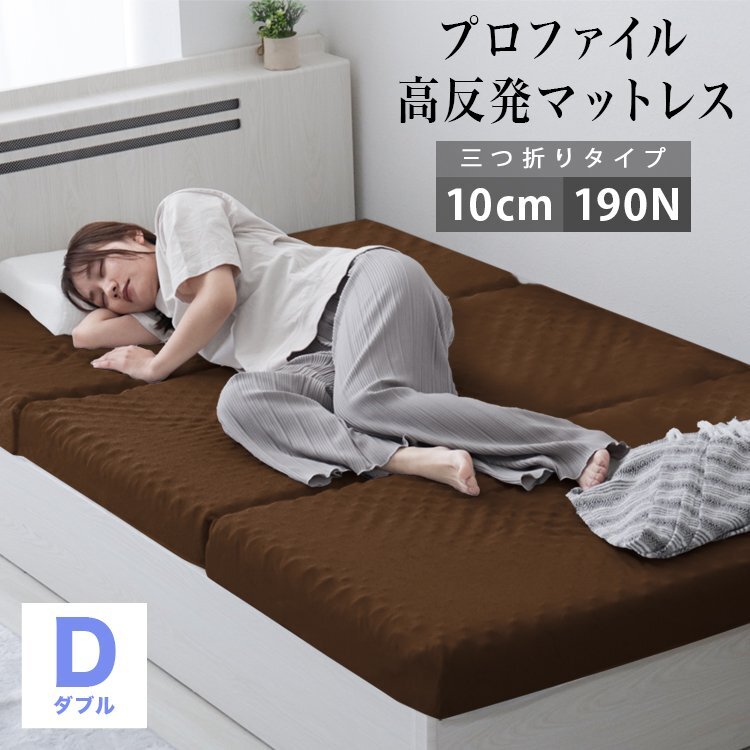 \体圧が分散されるプロファイルタイプ/ 凹凸した表面が、身体の形状に沿って変形するので、包まれるようなフィット感が生まれます。 負荷がかかりやすい腰回りなども持ち上げるように支え、身体の広い範囲へ圧力を分散します。 沈みこまない反発力で寝返りをサポート! 厚みたっぷり10cmで、1枚でも底付き感のない寝心地。 高反発マットレスは下からの跳ね返りの力により、沈み込みが少ないのが特徴です。 その為、寝返りがうちやすく就寝時の身体の一部分(首・肩・腰・足)にかかる体圧も分散。 寝返りが多い方や仰向けに寝ることが多い方にオススメです。 三つ折りタイプは、押入れなどに収納しやすく、立て掛けておいても場所をとりません。 カバーは取り外して洗濯することができます。 【商品仕様】 ・カラー:ブラウン ・サイズ:(約)幅140×奥行き195×厚さ10cm(ダブルサイズ) ・重量:(約)8.3kg ・硬さ:190ニュートン ・素材: マットレス本体:高反発ウレタン カバー:ポリエステル100% 【注意事項】 ・圧縮梱包されたままの状態で長期間保管した場合、マットレスが復元できなくなってしまいます。商品到着後、1週間以内に必ず圧縮から開放をして頂くようにお願いいたします。 ・マットレスは約1-2日で復元します。気温や温度により3-14日かかる場合もあります。 ・製品の臭いが気になりましたら、風通しの良いところで脱臭してください。この臭いは素材のウレタンによるもので無害です。臭いに敏感な方は十分ご検討の上、ご購入をお願いいたします。 ・【プロファイルタイプ】のマットレスは、ホワイトウレタンの特性により黄変する場合がございます。 ・マットの硬さは温度によって変わってきます。また、硬さの感じ方には個人差があります。 ・カバーは取り外して洗濯ができますが、マットレス本体は洗濯しないでください。 ・仕様・デザインは改良のため予告なく変更することがあります。 |