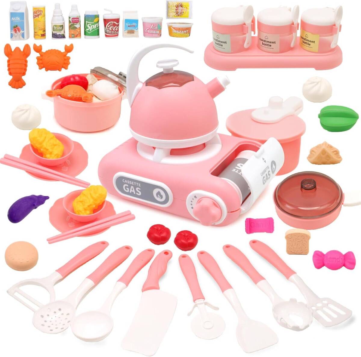 • 【豪華セット】51点の充実したセット内容。やかん、鍋、フライパン、調理器具、食材などが含まれ、本格的なごっこ遊びが楽しめます。