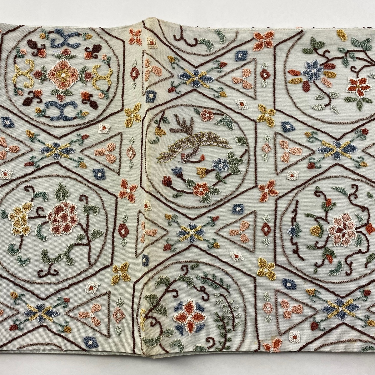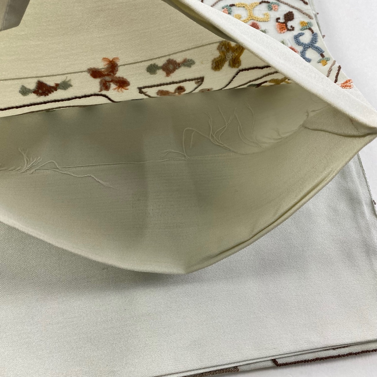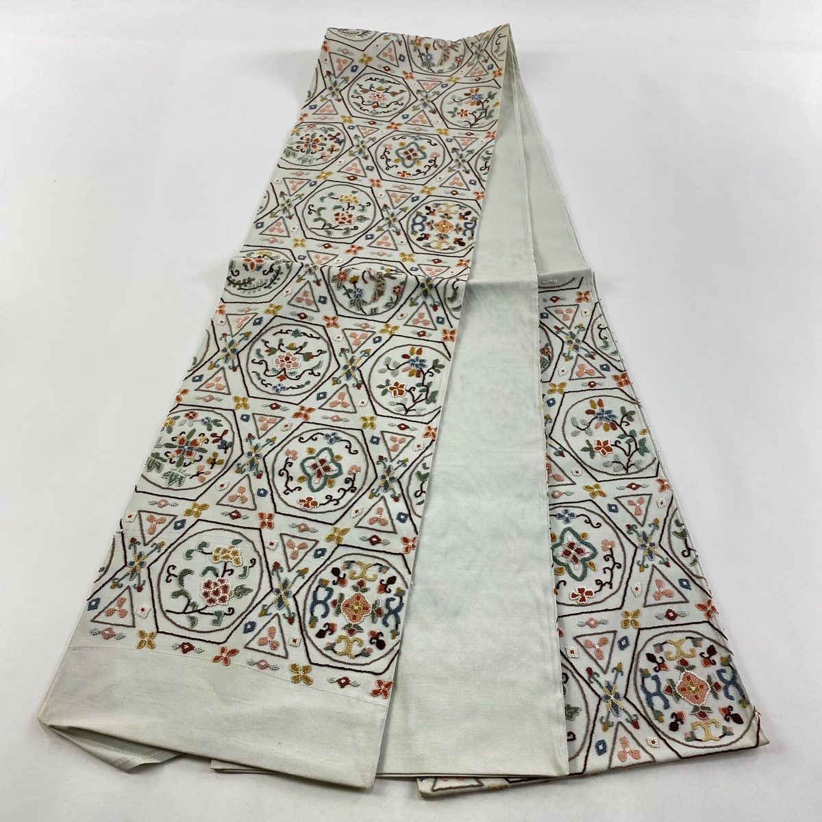| 袋帯 逸品 花鳥 亀甲 相良刺繍 金糸 薄緑 六通 正絹 【中古】 |