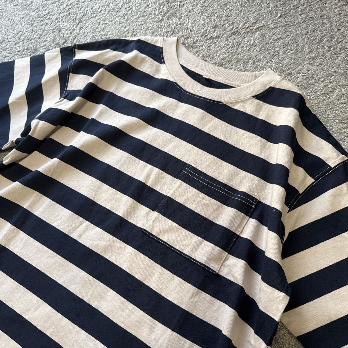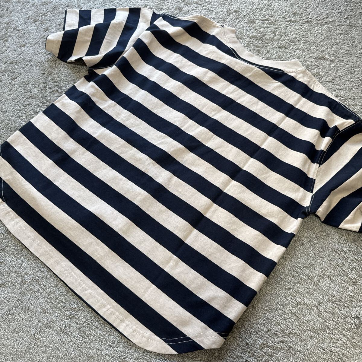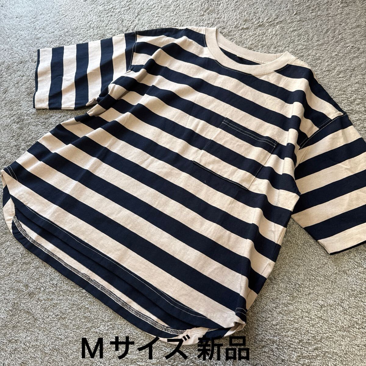 裾ラウンドポケット付ボーダー半袖Tシャツ紺ベージュです。 未使用タグ付きです。 自宅保存なので細かい事を気になさる方は ご入札を避けて下さいね♪ サイズはMサイズです。 平置きで身幅58センチ 着丈60センチ 素人なので多少の差はご了承ください。 品質は綿100%です。 実際のお色と画像は光の具合により 多少異なる場合があります。 | |||