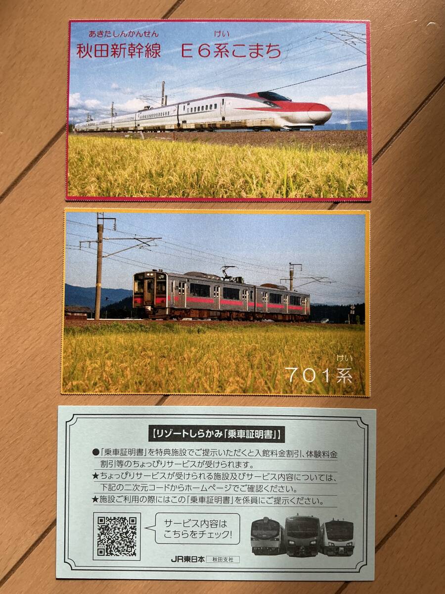【電車カード・駅カード(秋田管内2枚)】E6系こまち&701系、リゾートしらかみ乗車証明書