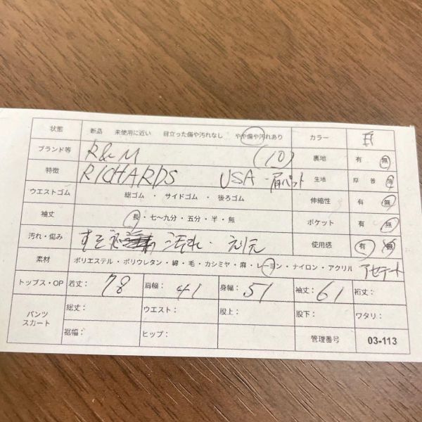 - ブランド:R&M RICHARDS by Karen Kwong - サイズ表記:10(L相当) - 素材:レーヨン56%、アセテート44% - カラー:アイボリー系 - シーズン:春夏フォーマル向け - 服の特徴:前面にゴールド調の刺繍&ビーズ装飾、長袖、ボタン留め、エレガントなデザイン 肩パット - ダメージ・汚れ詳細:すそ、腕に汚れ、シミあり - 袖の長さ:長袖 - 裏地:なし 03-113 即購入大歓迎・お得な割引各種あります 詳しくはプロフィールをご覧ください! 匿名&送料無料 海外輸入のため全て一点ものです 古着のため使用感・毛玉等があることもあります。写真で状態の確認を行なってからご購入ください おまとめ買いでお得な割引あります♪ 平置き採寸表→写真から確認いただけます! (素人採寸のため、多少の誤差はご了承ください) 商品状態に関しては、写真、商品説明欄に記載しております。着用回数、購入時期などはお答えできませんので、ご了承ください。着画、写真の追加もお断りしております。 簡易包装のコンパクト発送となります。 畳みシワはご了承の程、宜しくお願いいたします。 商品によっては圧縮してお送りするものもございます。 撮影環境や使用するモニター、反映されにくい色味など、 商品と画像に若干の色誤差が生じますことをご了承ください。 出品作業の際にしっかりと確認はしておりますが、シミなどの見落としがある場合もございますのでご了承下さい。 古着の取り扱いになりますので特有の匂い等がある可能性があります。ご理解のある方のみご購入の程お願い致します。