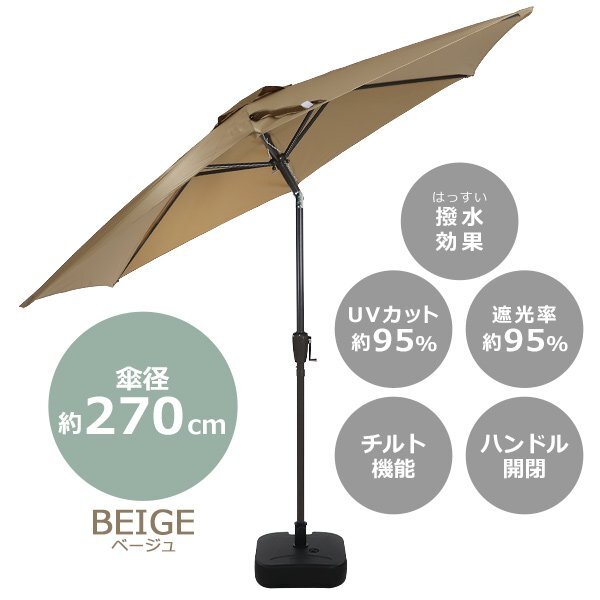 商品名 | 送料無料 ガーデンパラソル 直径約270cm ベースセット 撥水 UVカット 紫外線対策 日除け 日よけ 大型 チルト機能 角度調節 ハンドル開閉 紫外線対策 軽量 ベース付き 水 砂 ビーチパラソル パラソル スタンド BBQ アウトドア キャンプ 庭 カフェ parasolm706 |