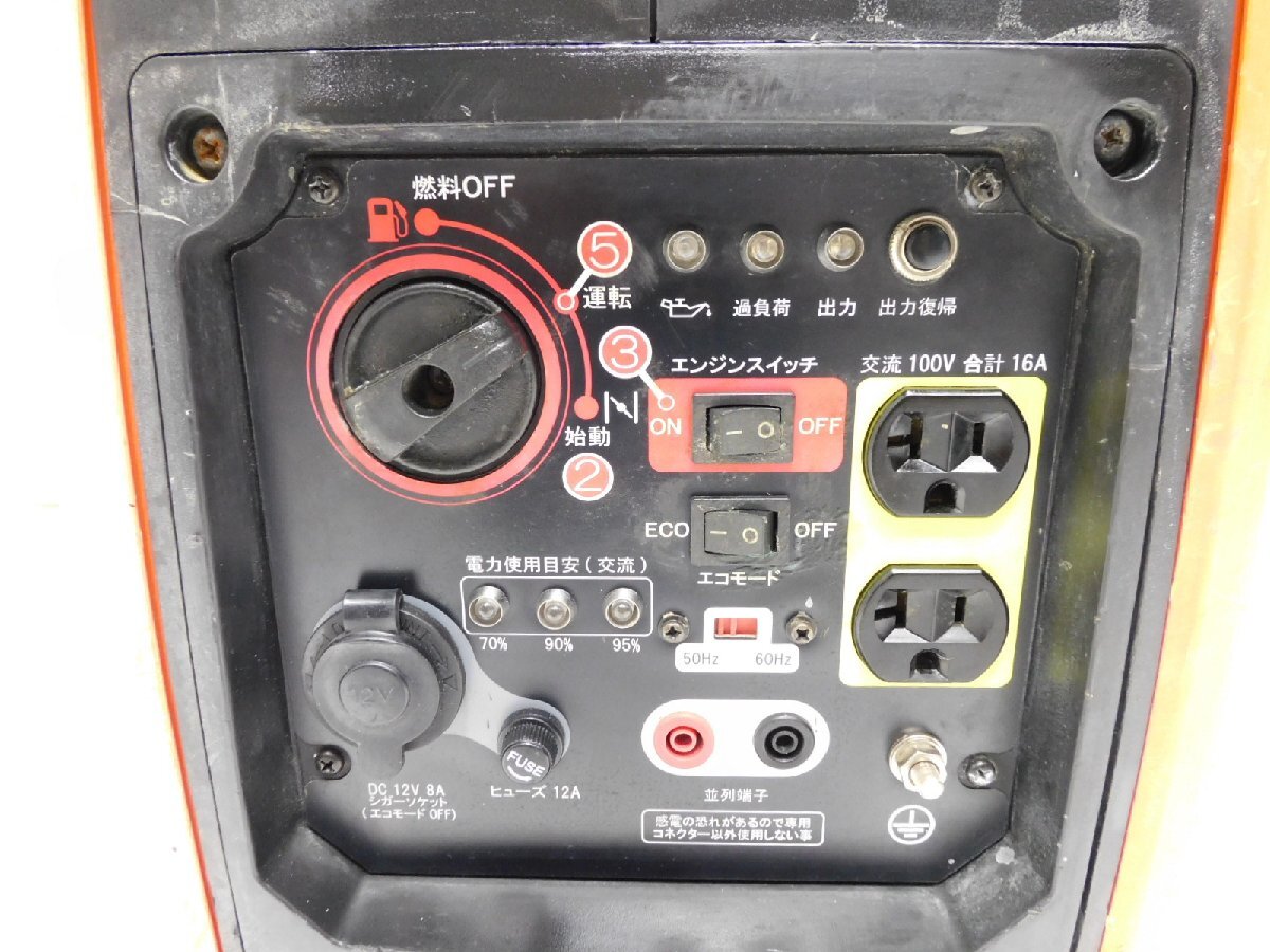 メーカー:KOSHIN 商品名:インバーター発電機 型式:GV-16i 周波数:50/60Hz 定格出力:1.6kVA 電圧:100V ●ガソリンエンジン 始動方式:リコイルスタータ式 燃料:ガソリン 燃料タンク容量:3.9L ●寸法・質量 全長×全幅×全高:498×293×467mm 乾燥質量:22kg 【整備箇所】 エンジンオイル交換 キャブレター 【点検箇所】 燃料タンク エアークリーナー フィルター 燃料ホース その他調整 清掃 レジャー、防災用電源など多用途に使える ガソリン発電機 動作確認済みです。 |