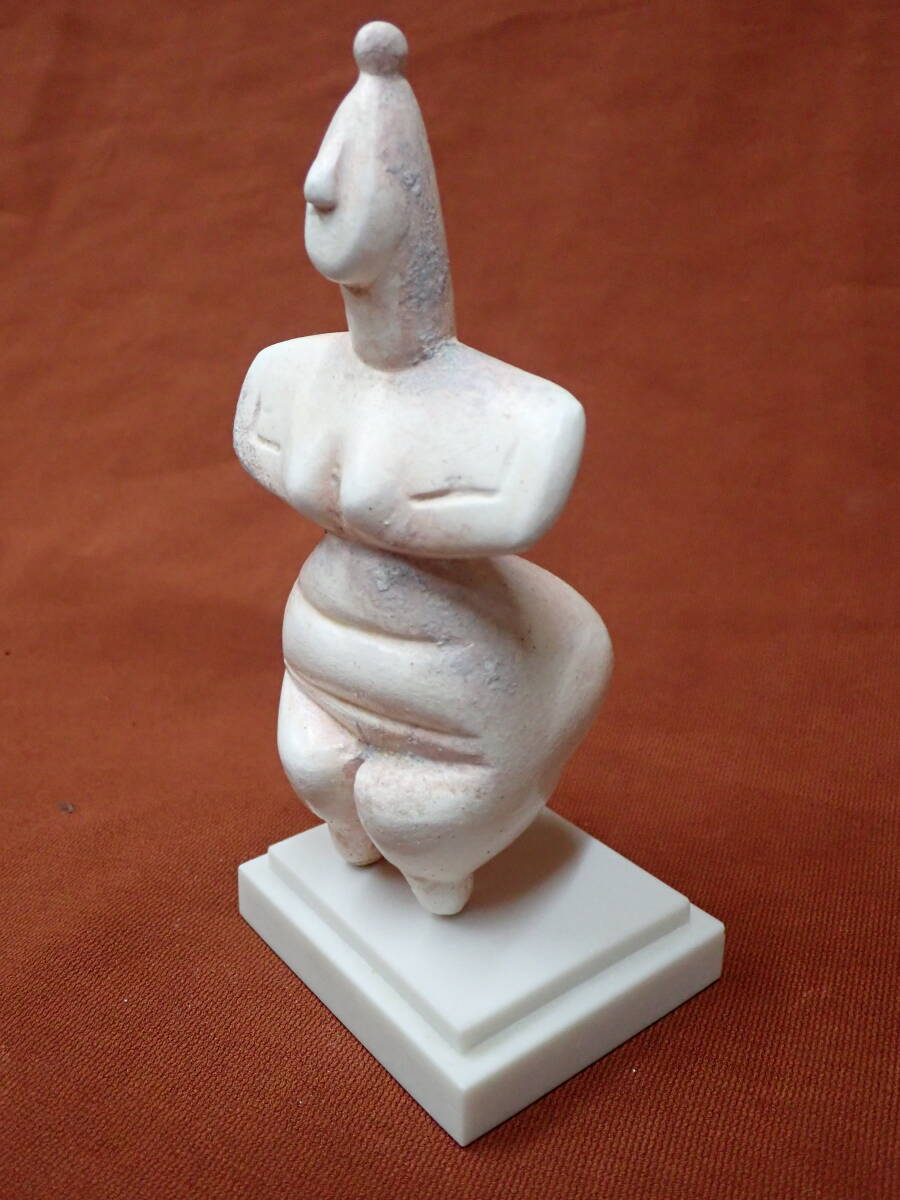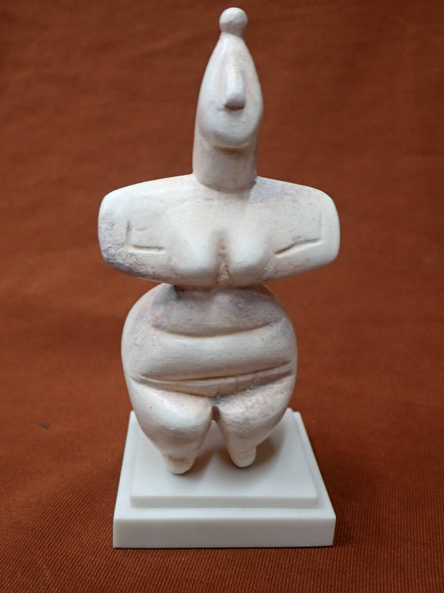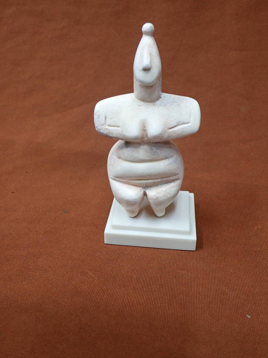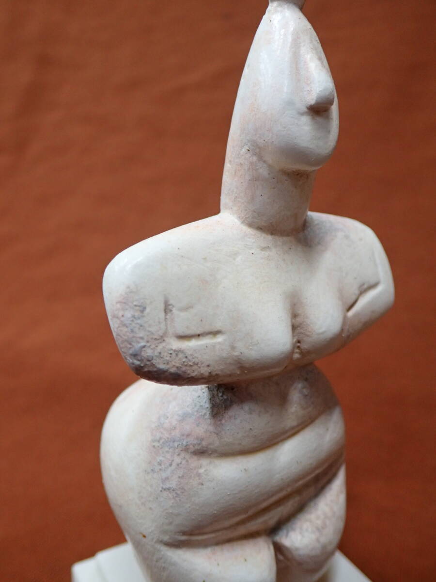 3000年ほど前のメソポタミア、アナトリア地域の地母神像です。ギリシャのキクラデスの造形にもこの形があるようです。素材は石のようですが正確には解りません。真贋など解りません。机上に飾っても良いものと思われます。 本体約14cm