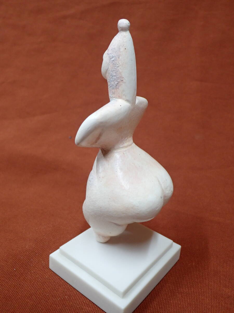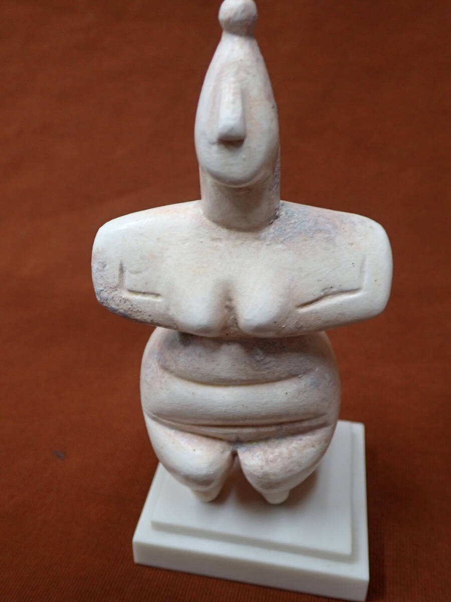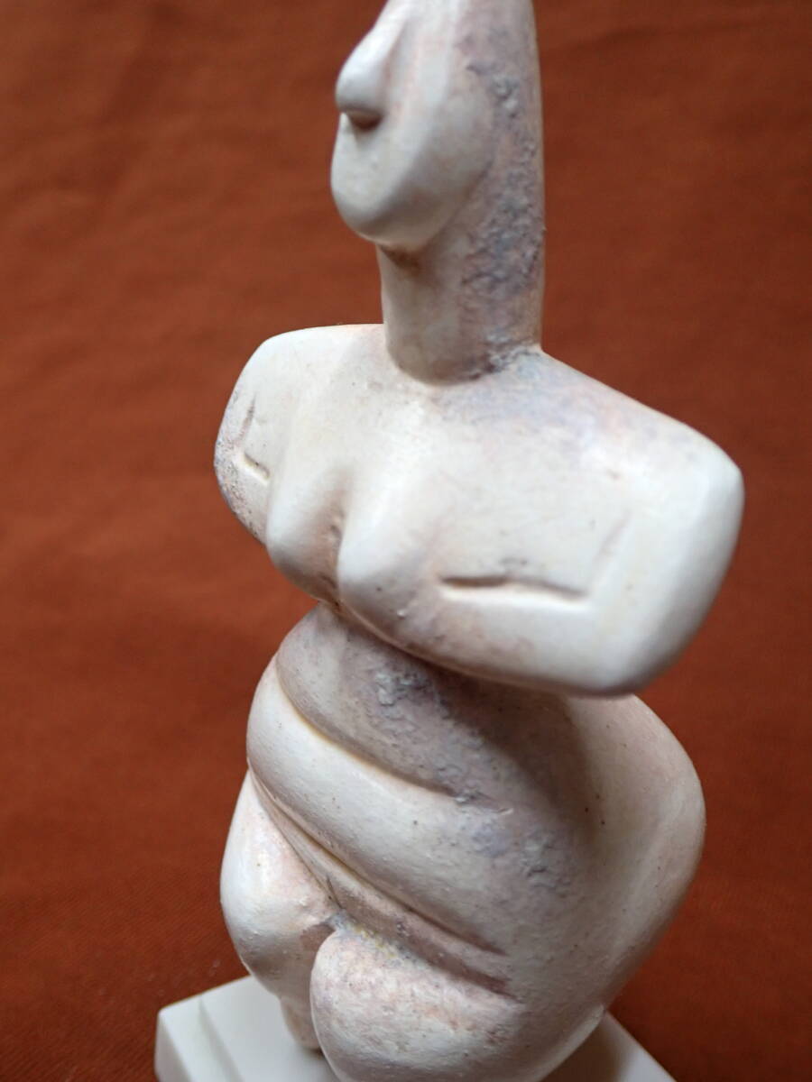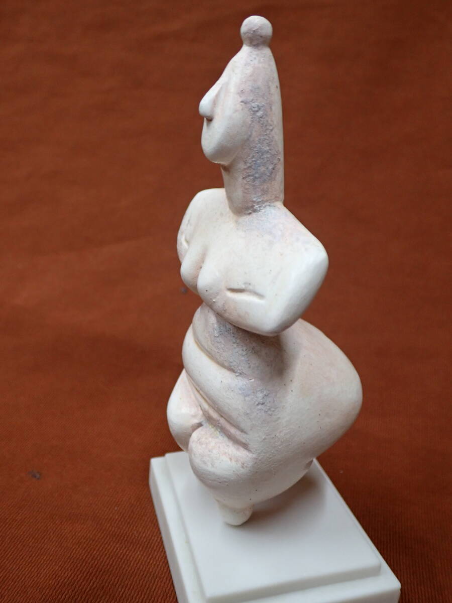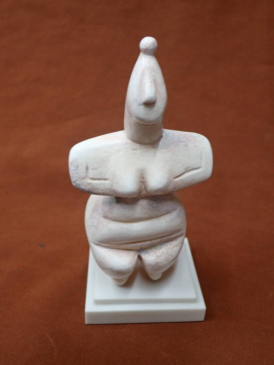3000年ほど前のメソポタミア、アナトリア地域の地母神像です。ギリシャのキクラデスの造形にもこの形があるようです。素材は石のようですが正確には解りません。真贋など解りません。机上に飾っても良いものと思われます。 本体約14cm