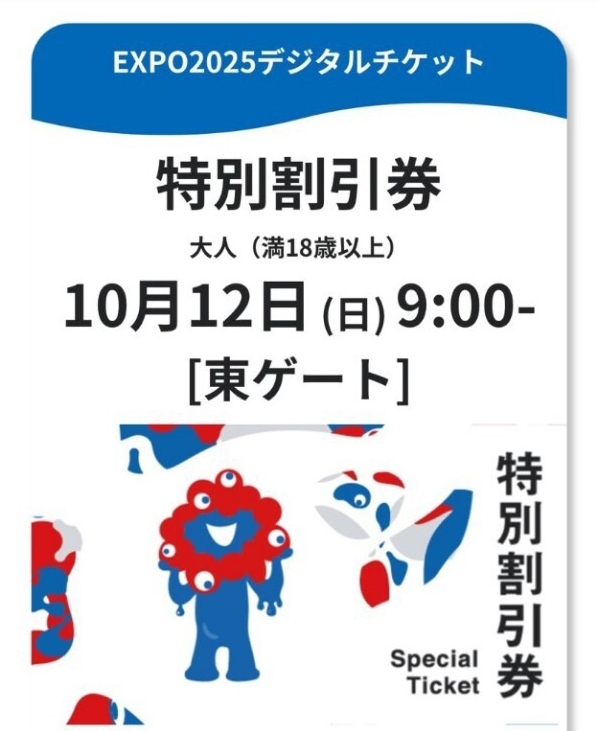2025大阪・関西万博の10月12日(日)9時台 東ゲート入場の予約済みチケット(特別割引券)の1枚です。