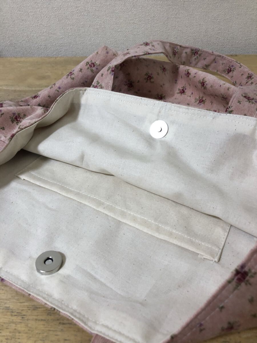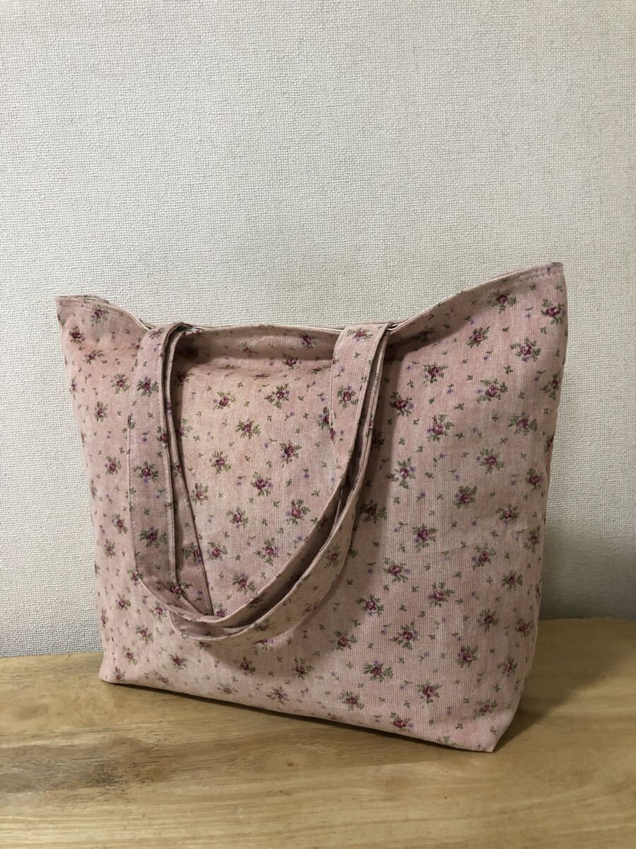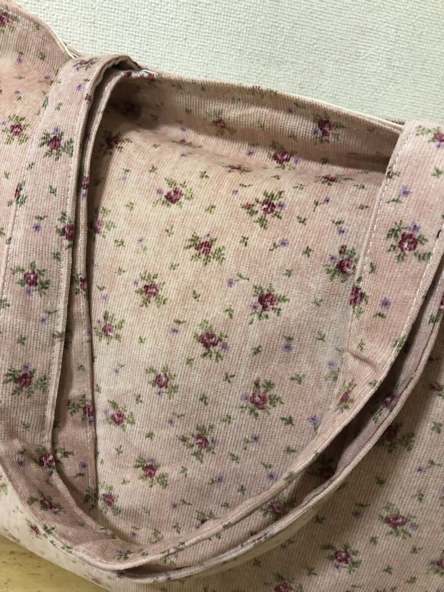 アクセスありがとうございます。ピンク系小花柄のコーデュロイ生地で大きめ肩掛けトートバックを作りました。サイズは縦30×横40まち10持ち手48センチです。まちをたっぷりとっておりますので荷物も沢山入りますよ。送料はレターパックライト430円でお届けできます。他にも出品しておりますので宜しければご覧ください。