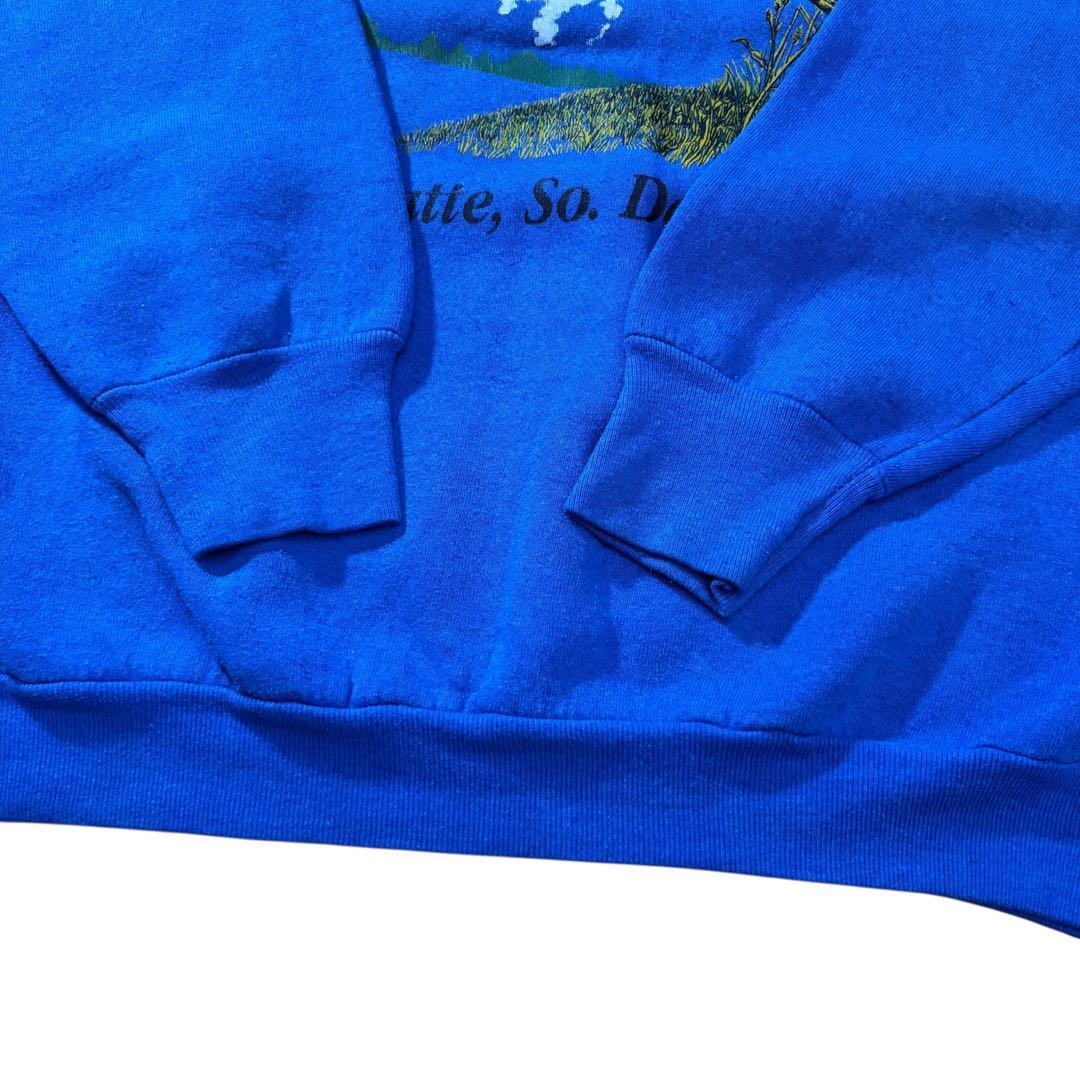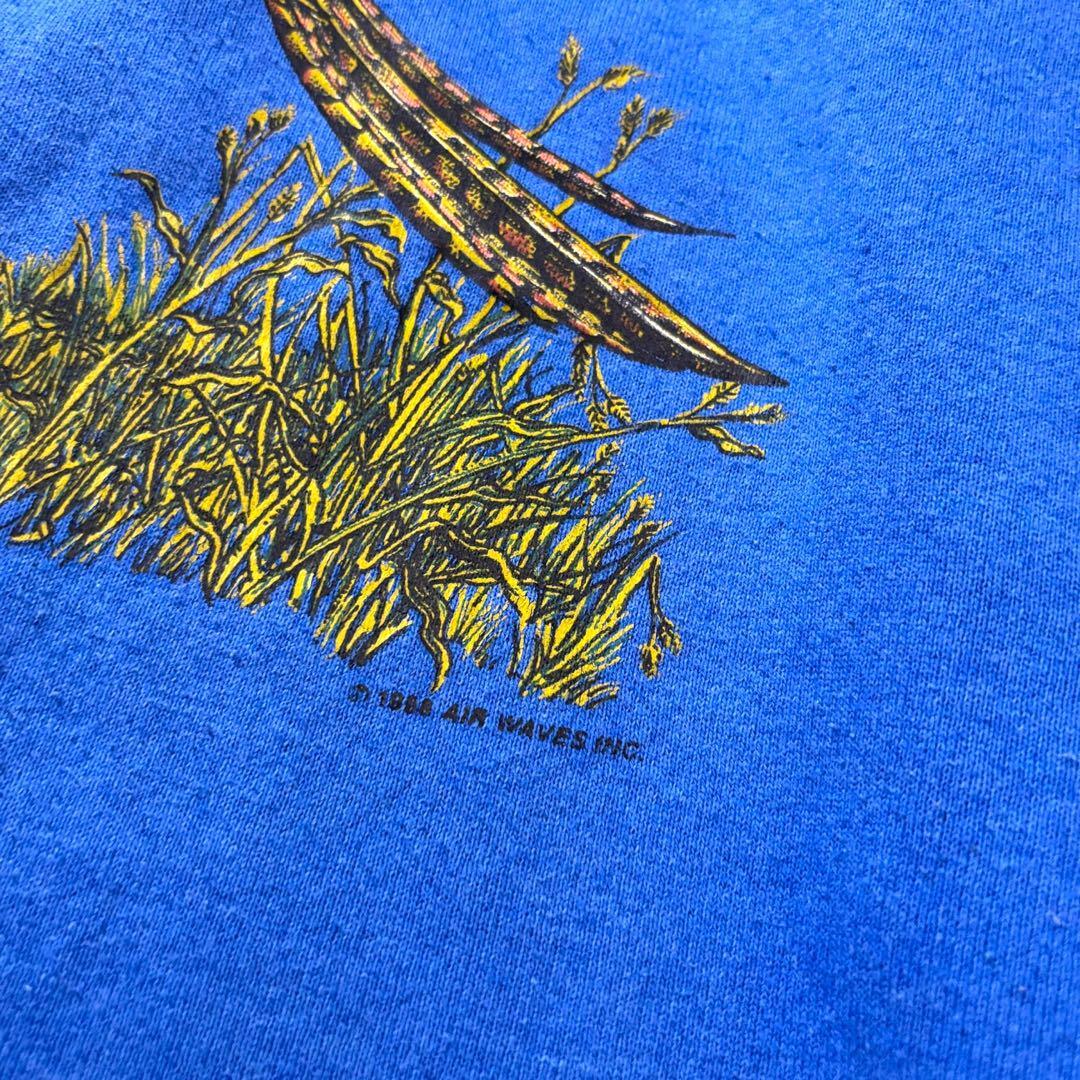 鮮やかなロイヤルブルーのボディに多色刷りプリントが映える、80sアメリカらしいスーベニアデザインです。