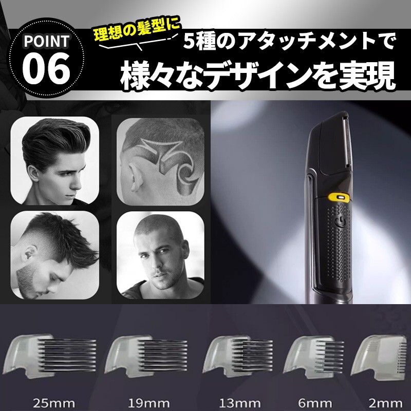 ブレードガード(2mm)、6mm、13mm、19mm、25mmの5種類のアタッチメントが付属しておりロング、ミディアム、ショートなど、お好みの長さに髪や髭を整えることができます。