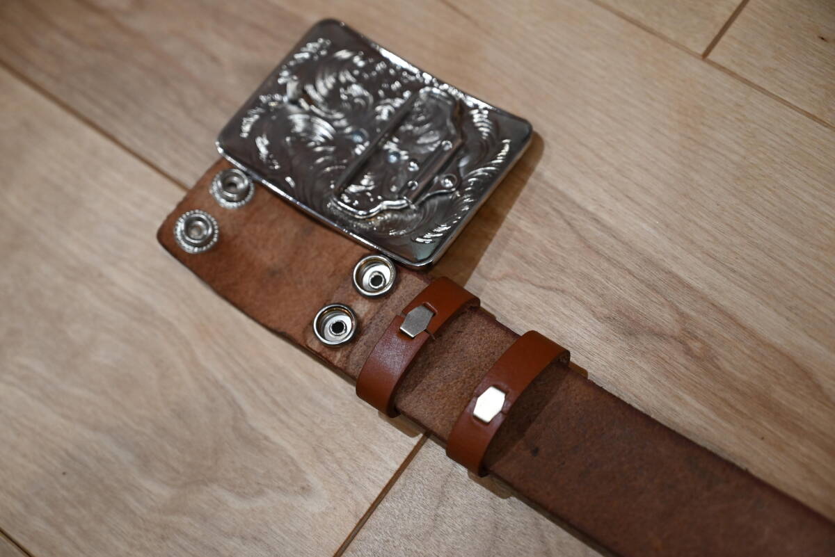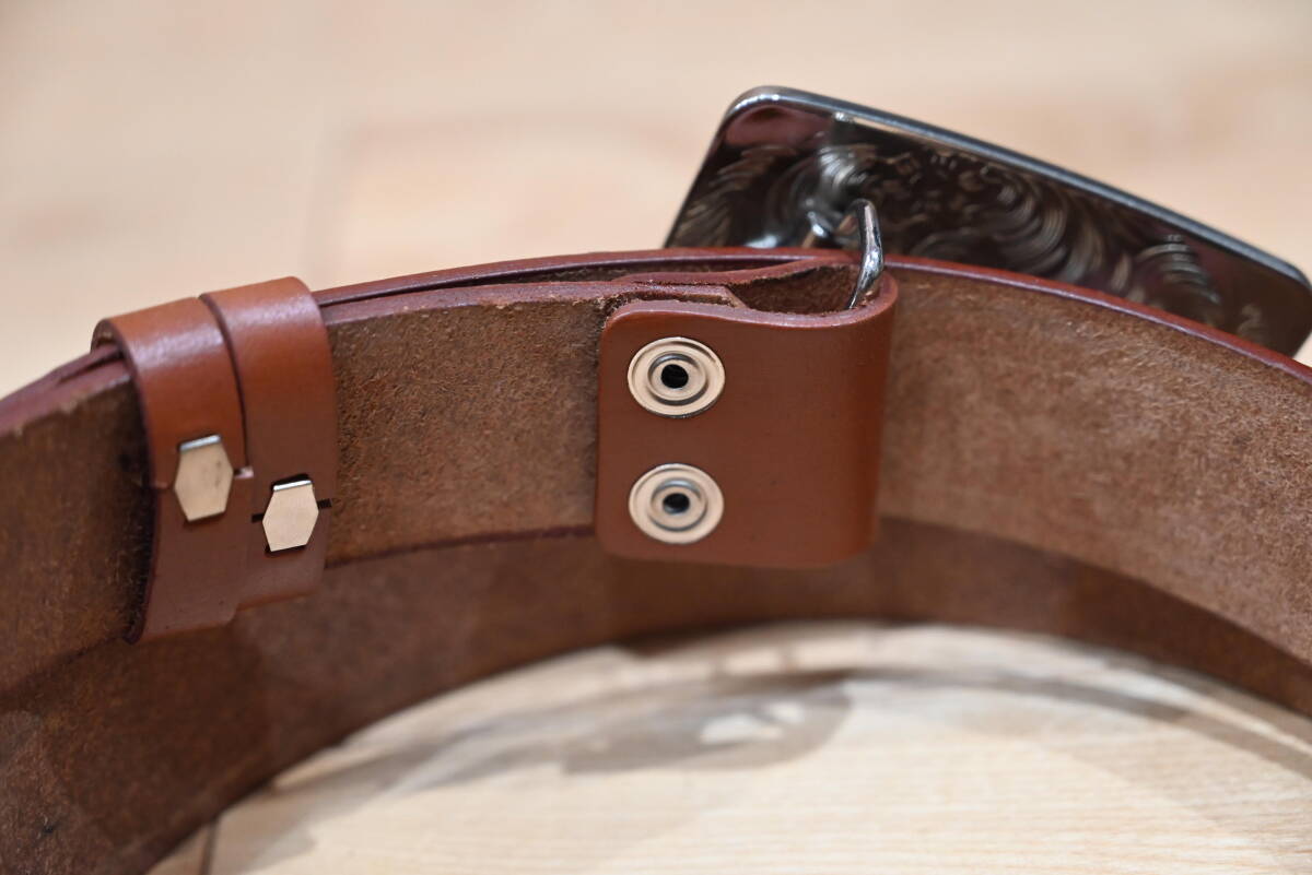 商品説明 | 1枚の牛革で作成した、カービング柄 バックル付きベルトです。 色はブラウンで、未使用品になります。 サイズは、ベルト本体は137㎝、幅は3.8㎝、バックルは四角で約縦6㎝×横8.5㎝程になります。 サソリと「SCORPIONS」のロゴを交互にデザインしてペイント仕上げをしてます。革の厚さは約3㎜程になります。通常サイズより長い品物になります。 バックルはエスニック柄で中央に金色のサソリを入れたデザインになってます。この点はインパクトが出ています。素材は、ニッケルになります。 ベルトの穴あけは、購入者の方にお願いします。フリーサイズで可能になるよう当方では加工無しの状態で出品致します。 発送は、定形外郵便を利用します。送料は、660円になります。 こちらは、ハンドメイドなので、多少の傷や汚れ等はご了承下さい。細かい点まで、気になる方はご遠慮下さい。 |