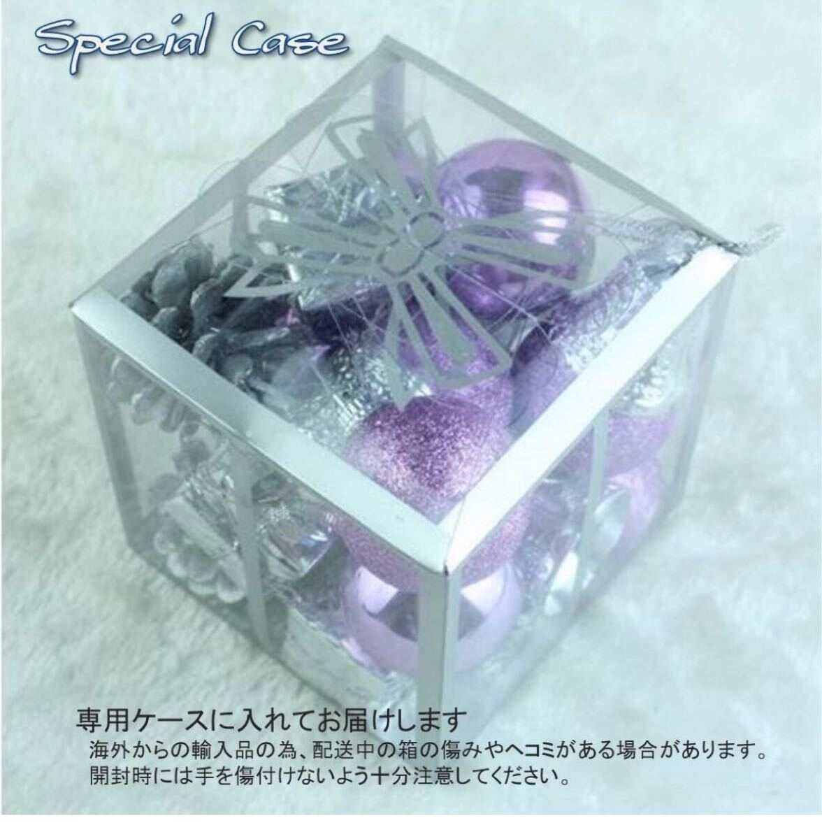 セット内容:ベル シルバー ×4個、 4㎝ ボール バイオレット ×4個、 4㎝ ボール ラメ バイオレット ×4個、松ぼっくり シルバー ×4個、プレゼント シルバー ×4個