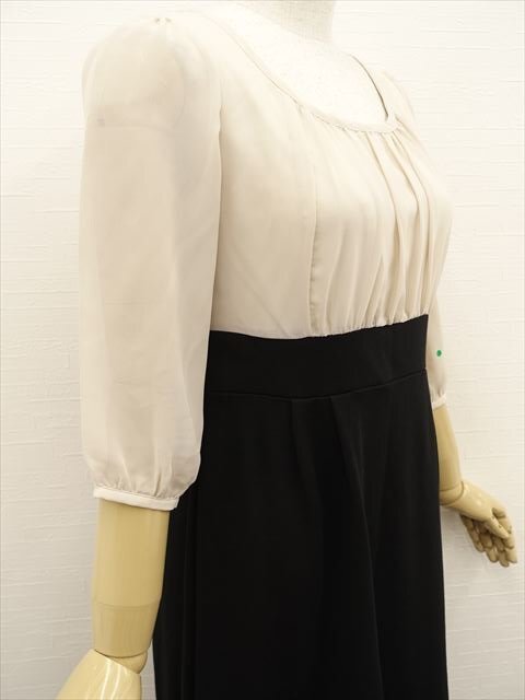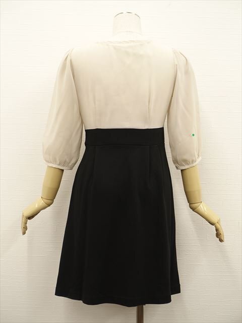 ひざ丈 パフスリーブ 七分袖 ラウンドネック シフォンドッキングワンピース S ベージュ×ブラック