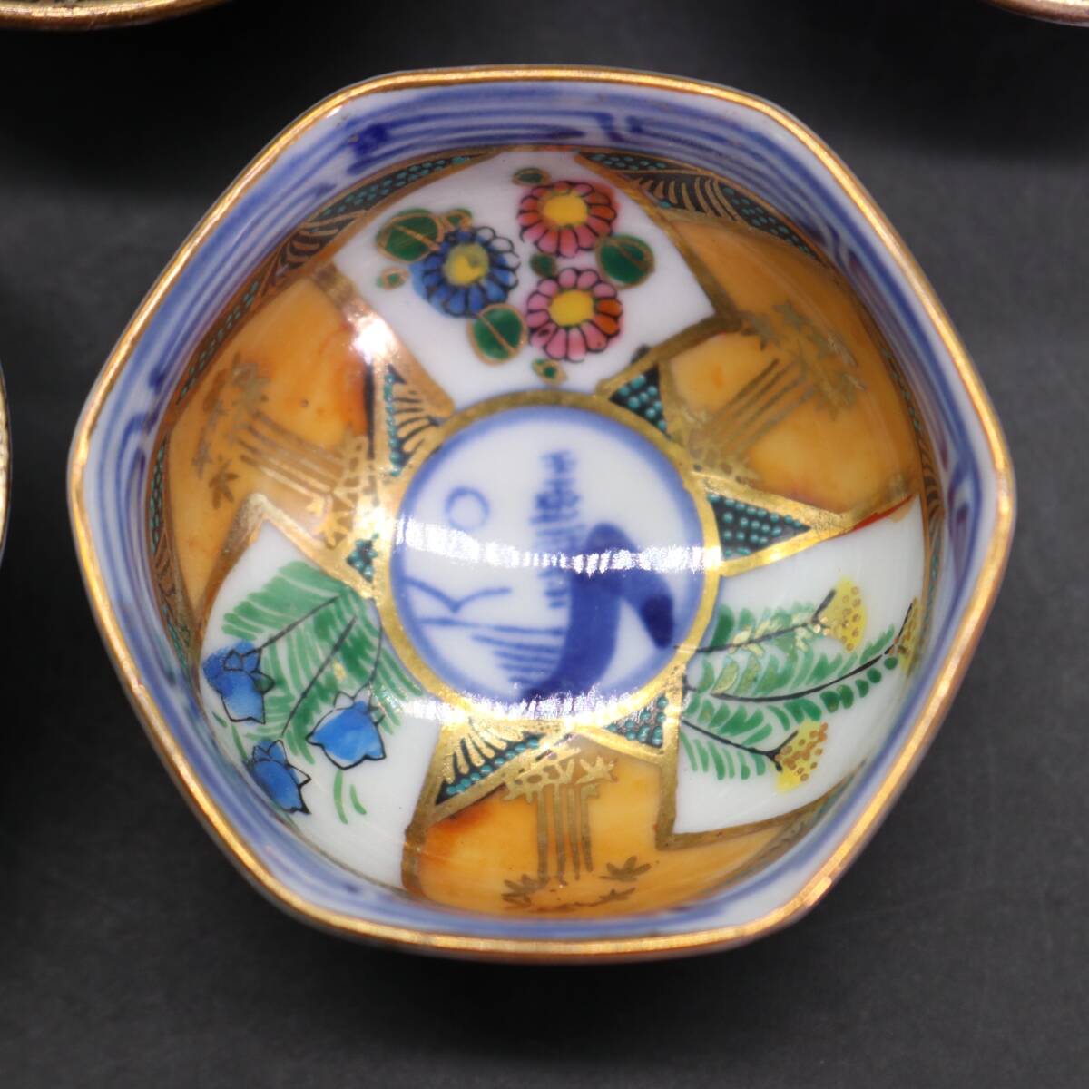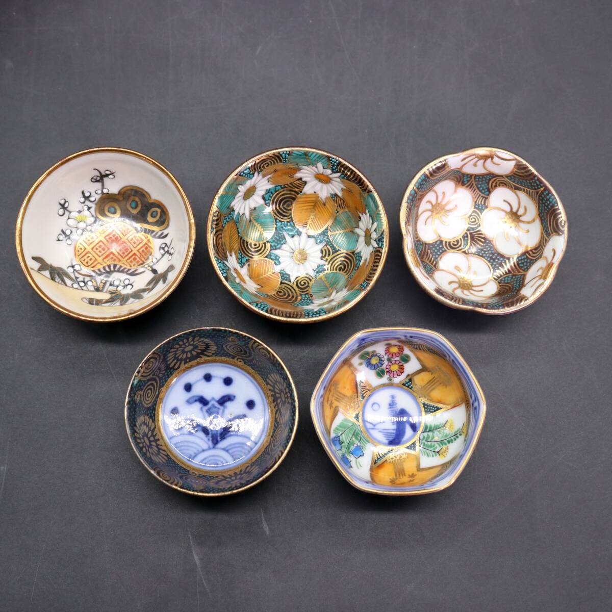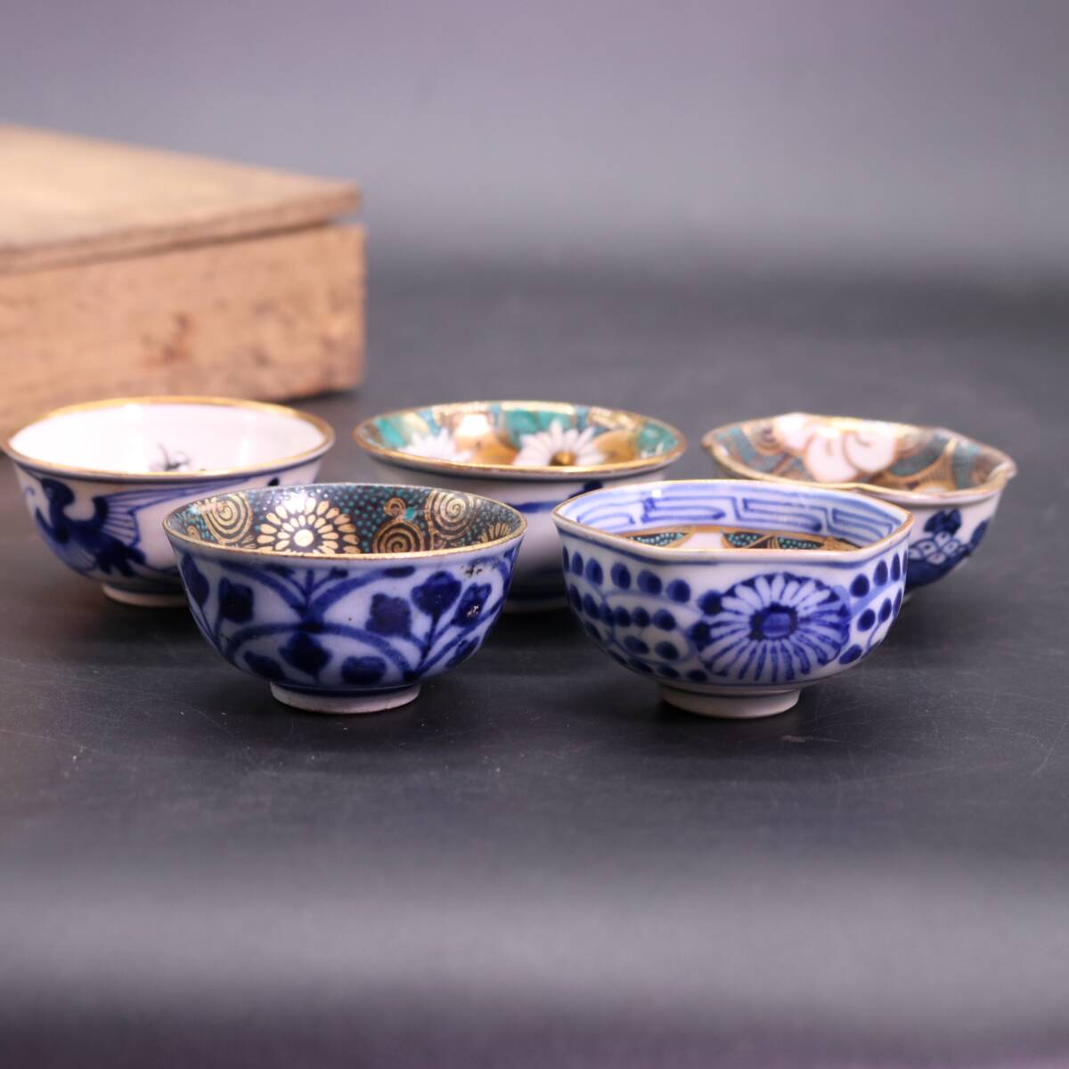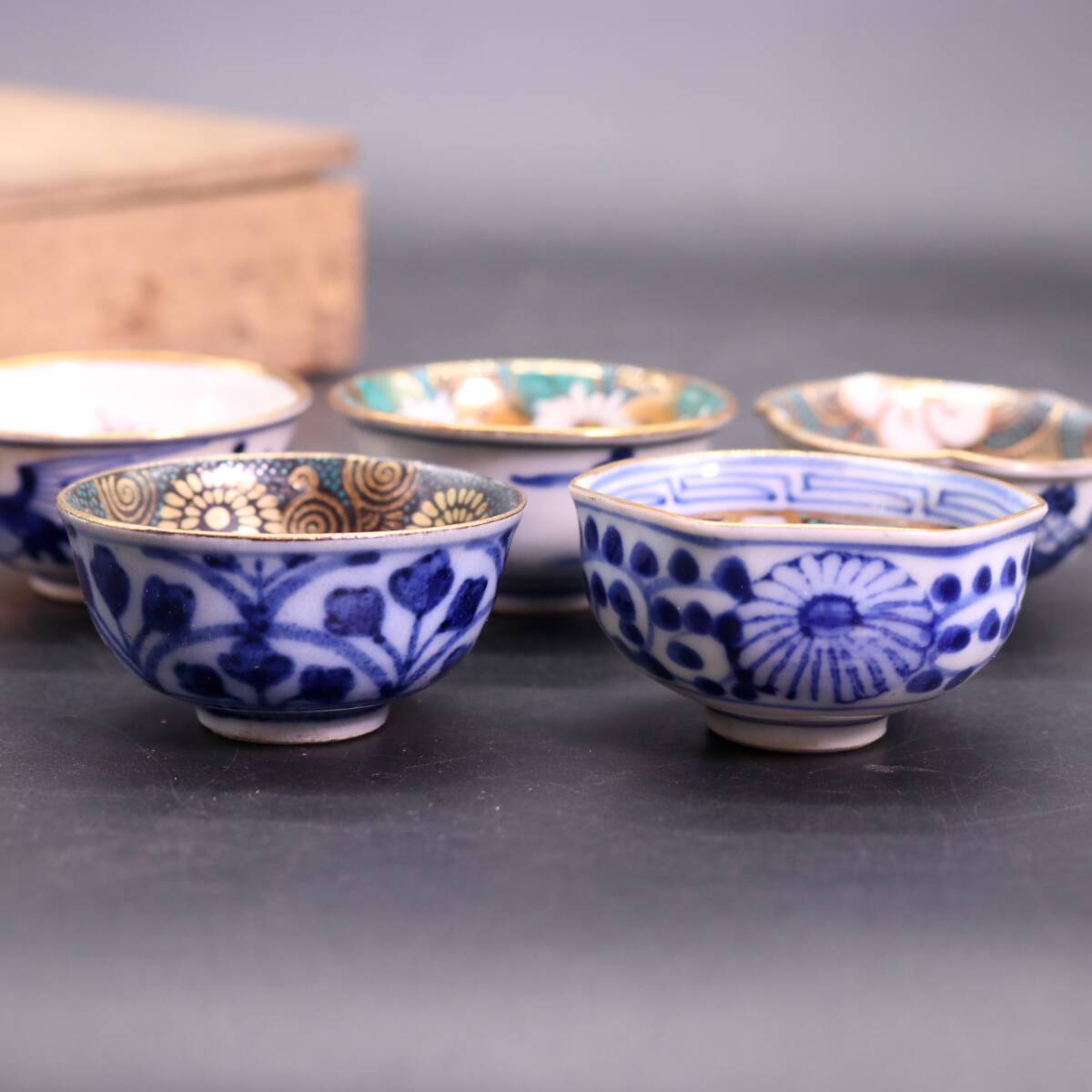 C1018 九谷焼 盃 5客 共箱 国産 金彩 花 手描き 酒器 陶芸 高田商店 骨董品