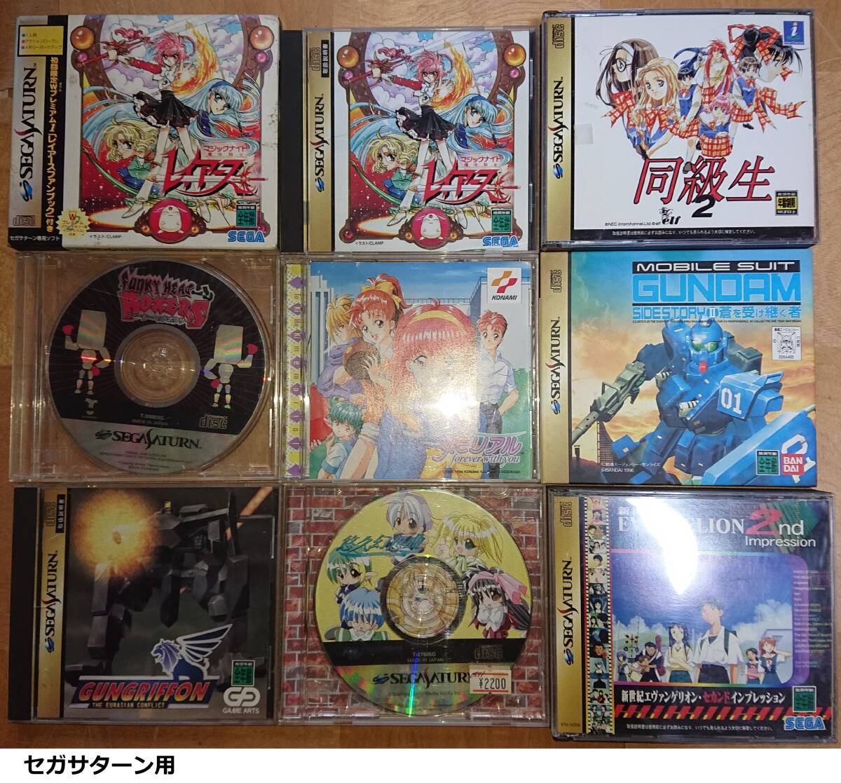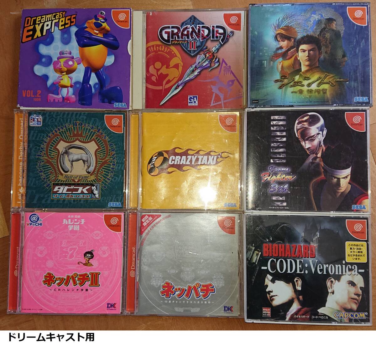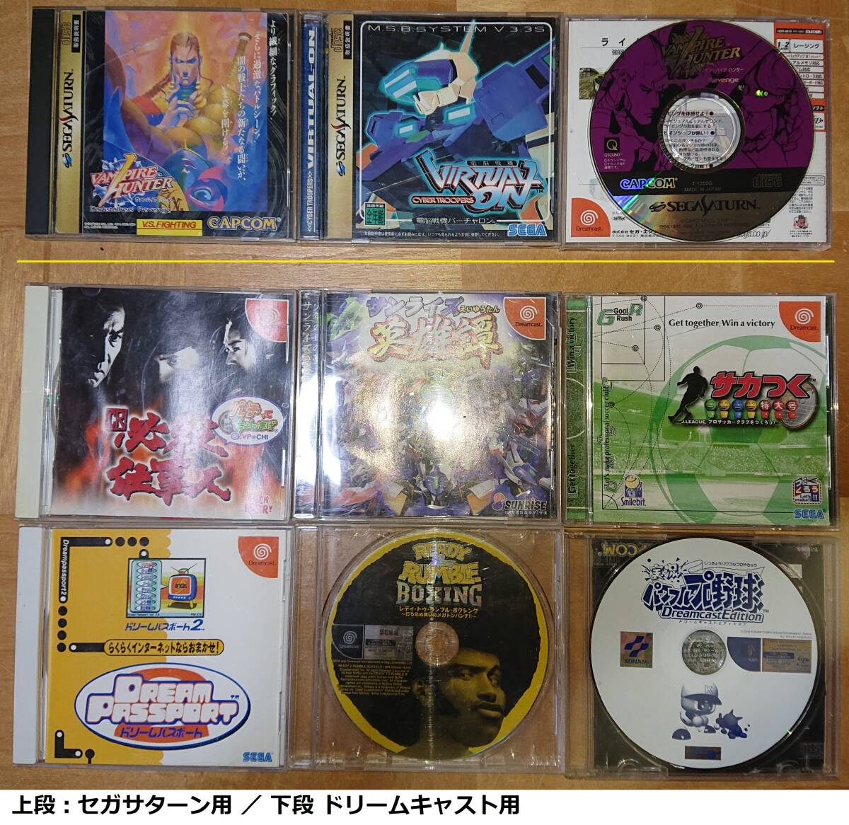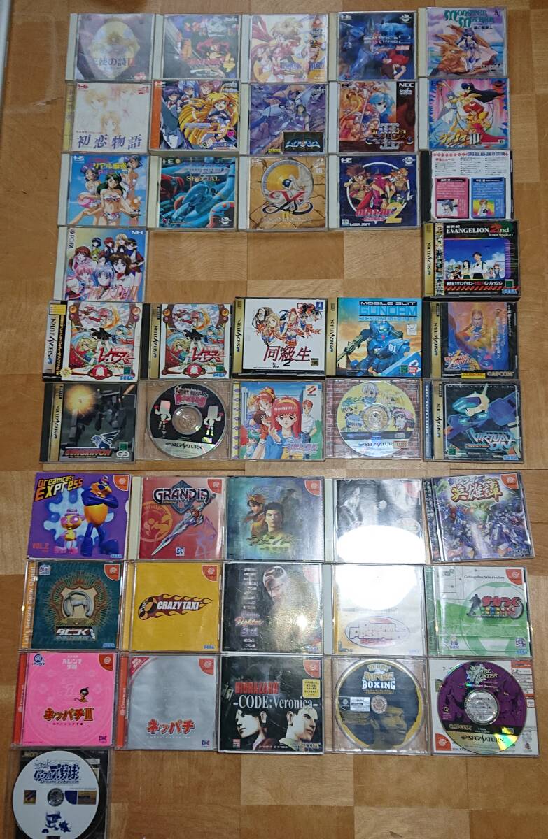 PCエンジン用CD-ROMROM、セガサターン用、ドリームキャスト用と入り乱れています、混在ですので仕分けして転売用に宜しいかと。動作確認は一切出来ないジャンク品にて、如何なるクレーム値引き返品一切不可!。ケースに割れ傷有り、取説無い物も有ります、ケースや取説に関しての程度はかなり悪いです、ばら売り一切不可!