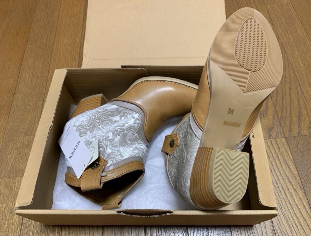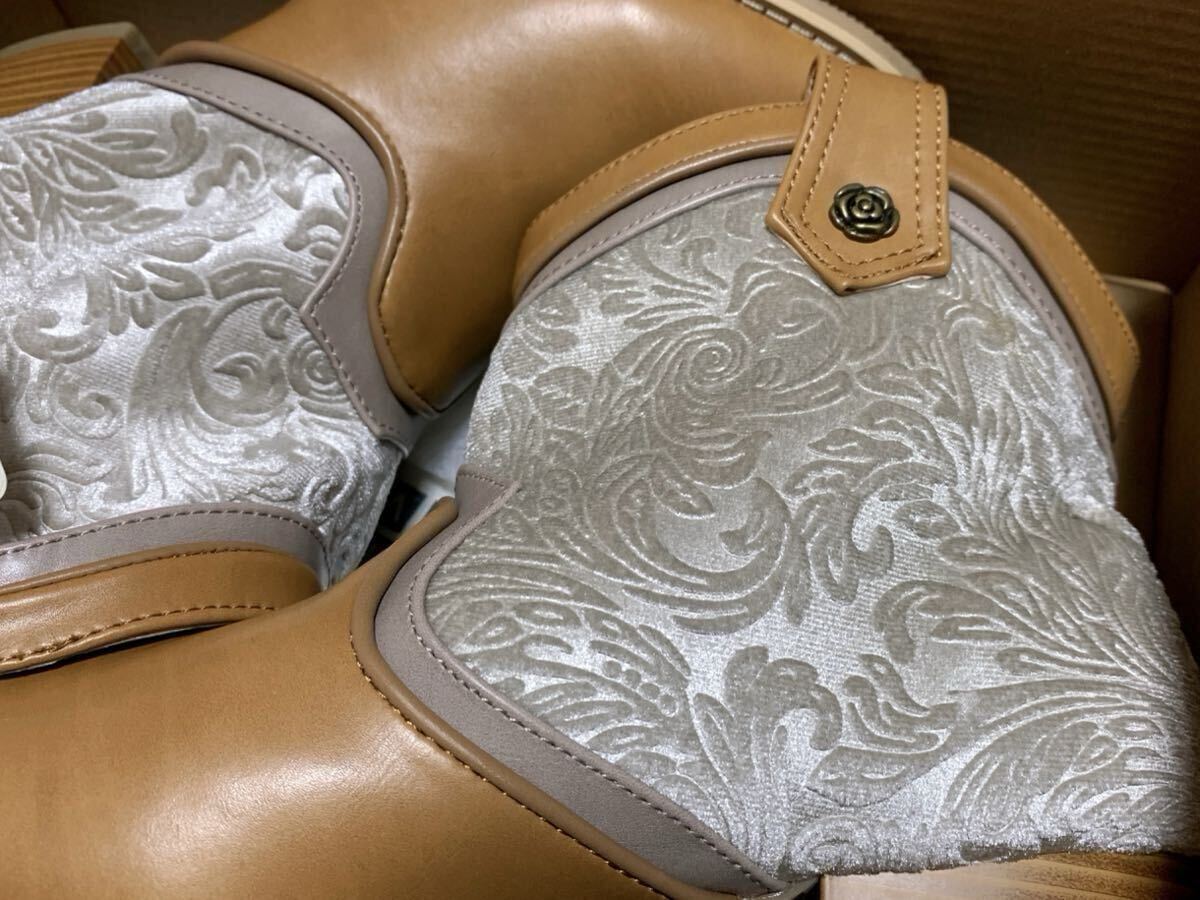 型押しのベロアが新鮮なショート丈のウエスタンブーツです。パイピングと切り替えの配色にこだわり、バラの金具でaxestemmeらしさをプラス。ショートブーツなのでボトムの丈を選ばずお使いいただけます。