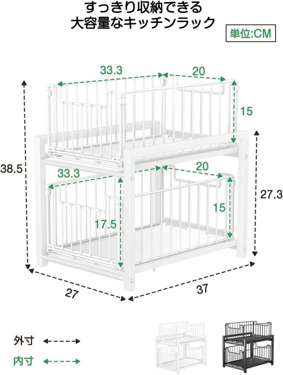 【シンク下 収納 スライド商品仕様】サイズ全体:幅27×奥行37×高さ38.5cm 引き出し×2(内寸):幅20cm×奥行33.3cm×高さ15m 上段から下段:17.5cm/材質:フレーム・引き出し・パイプ :炭素鋼/重量:約2.2kg/2色展開:ホワイト/ブラック/耐荷重:引き出し一個約15Kg 総耐荷重30Kg