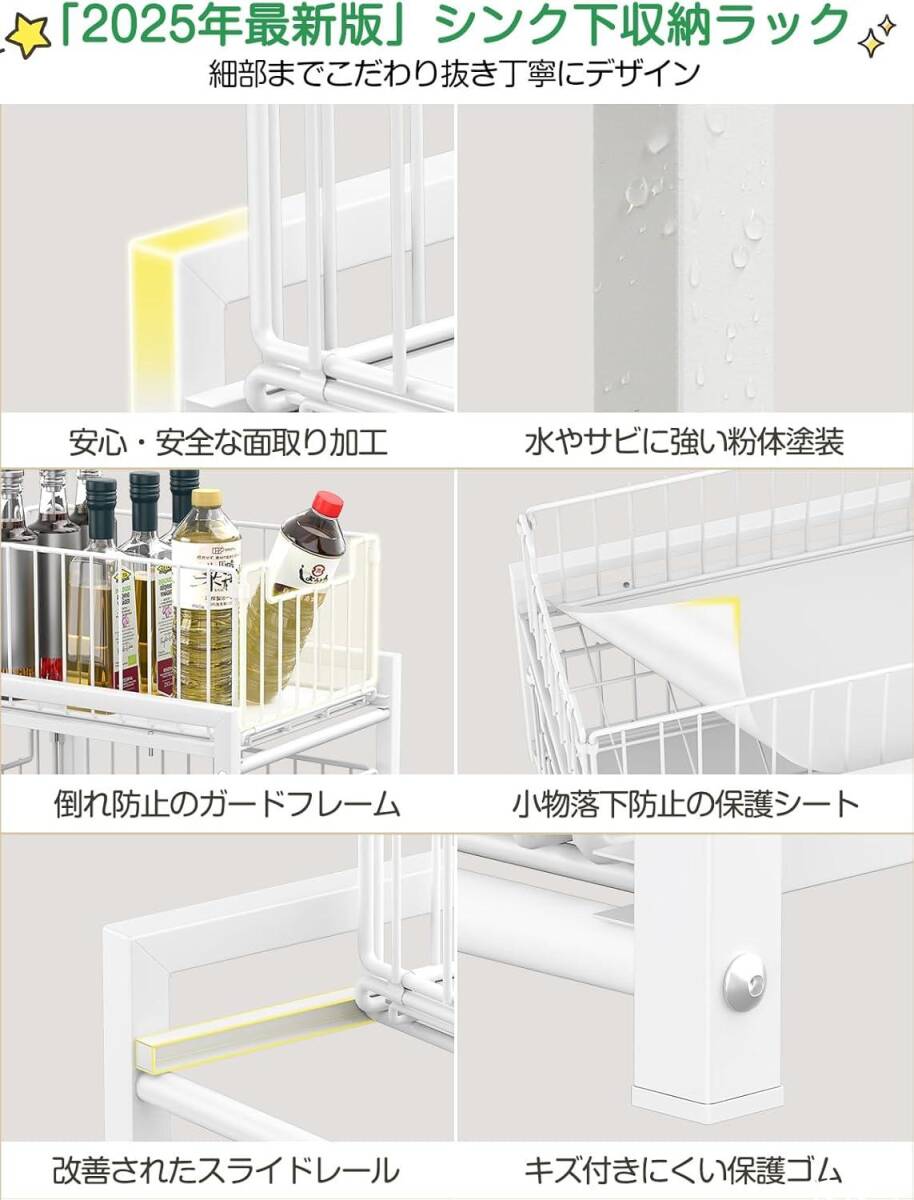 【お手入れも楽々】◎防サビ加工:引き出しやフレームにはしっかり防サビ加工を施してある。シンクの下や洗面台の下など湿気の多い場所で使うのに最適。◎丁寧に仕上げた滑らかな加工:フレーム角には滑らかな加工を施し、安心してお使いいただける。