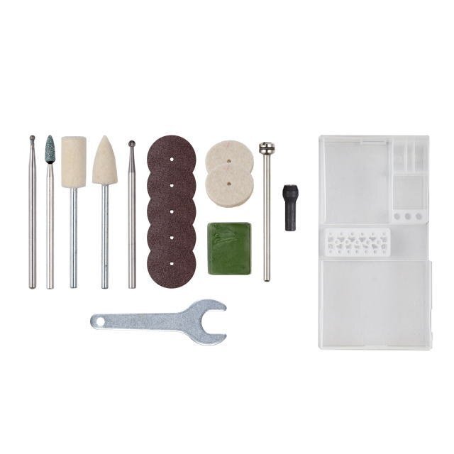備考 | <付属品> ・専用トランス MT58 ・ダイヤモンドビット 1本 ・軸付き砥石GC 1本 ・純毛バフ(棒)1本 ・純毛バフ(矢)1本 ・純毛バフ(ディスク)2枚 ・ハイスビット 1本 ・切断砥石 5枚 ・専用シャフト 1本 ・研磨材(青棒)1個 ・コレットチャックφ2.35(本体装着済)/3.0㎜各1 ・ビットケース ・専用スパナ |