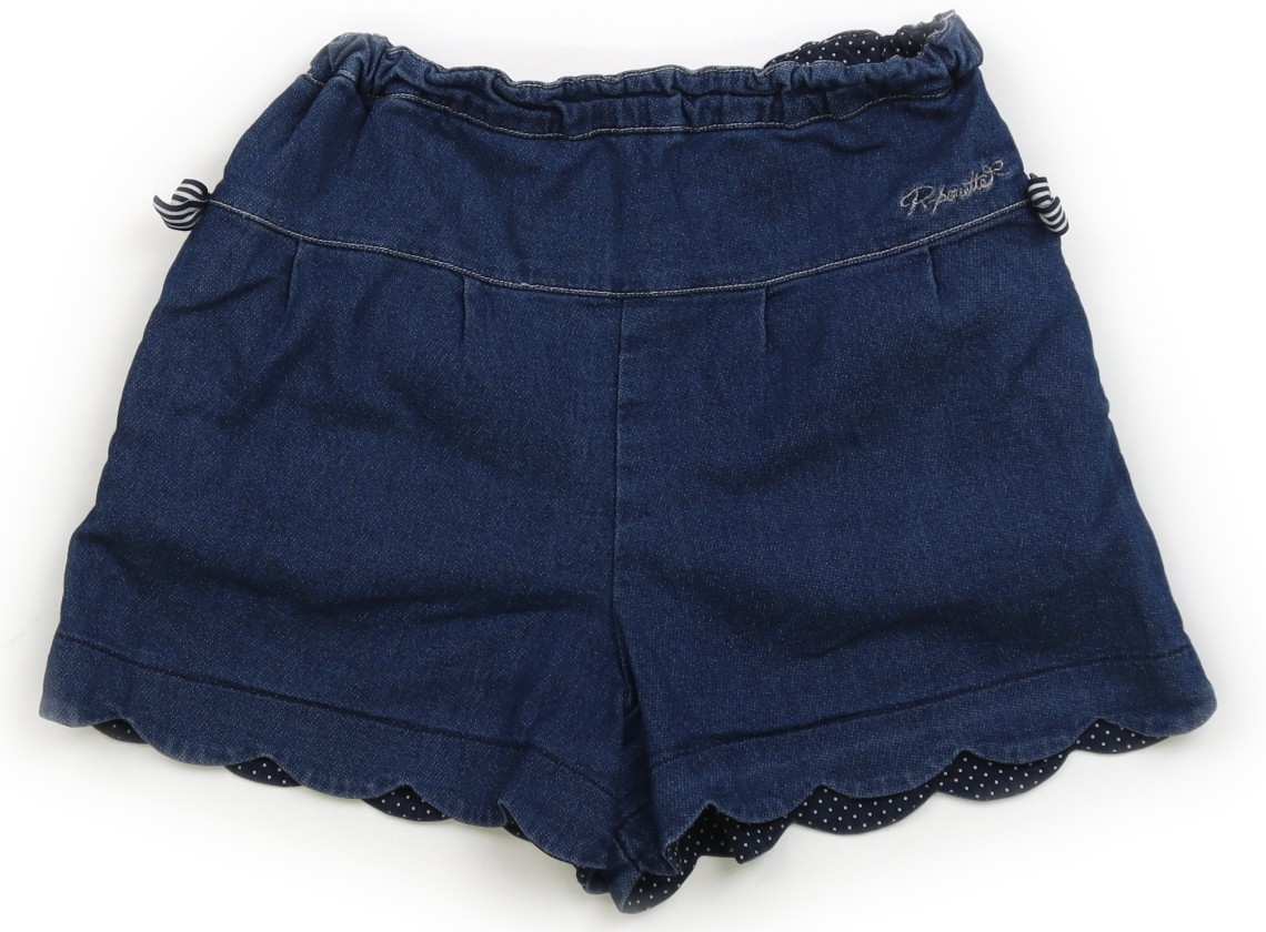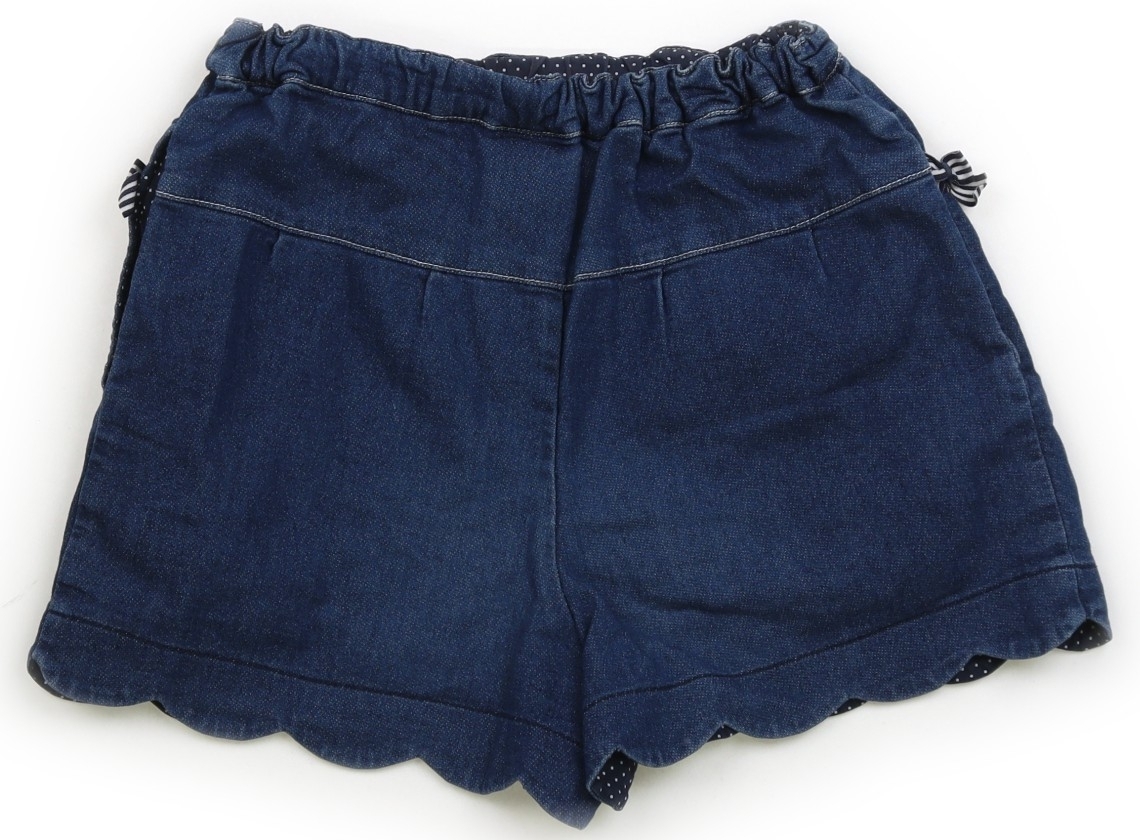 実際のサイズ表記は120-130cmです。裏パイルスウェット生地です。ウエストにサイズ調整ゴムが付いています。ウエストゴムがねじれています。ヒップに若干擦れ感があります。普段使いにいかがでしょうか。裾はスカラップデザイン。