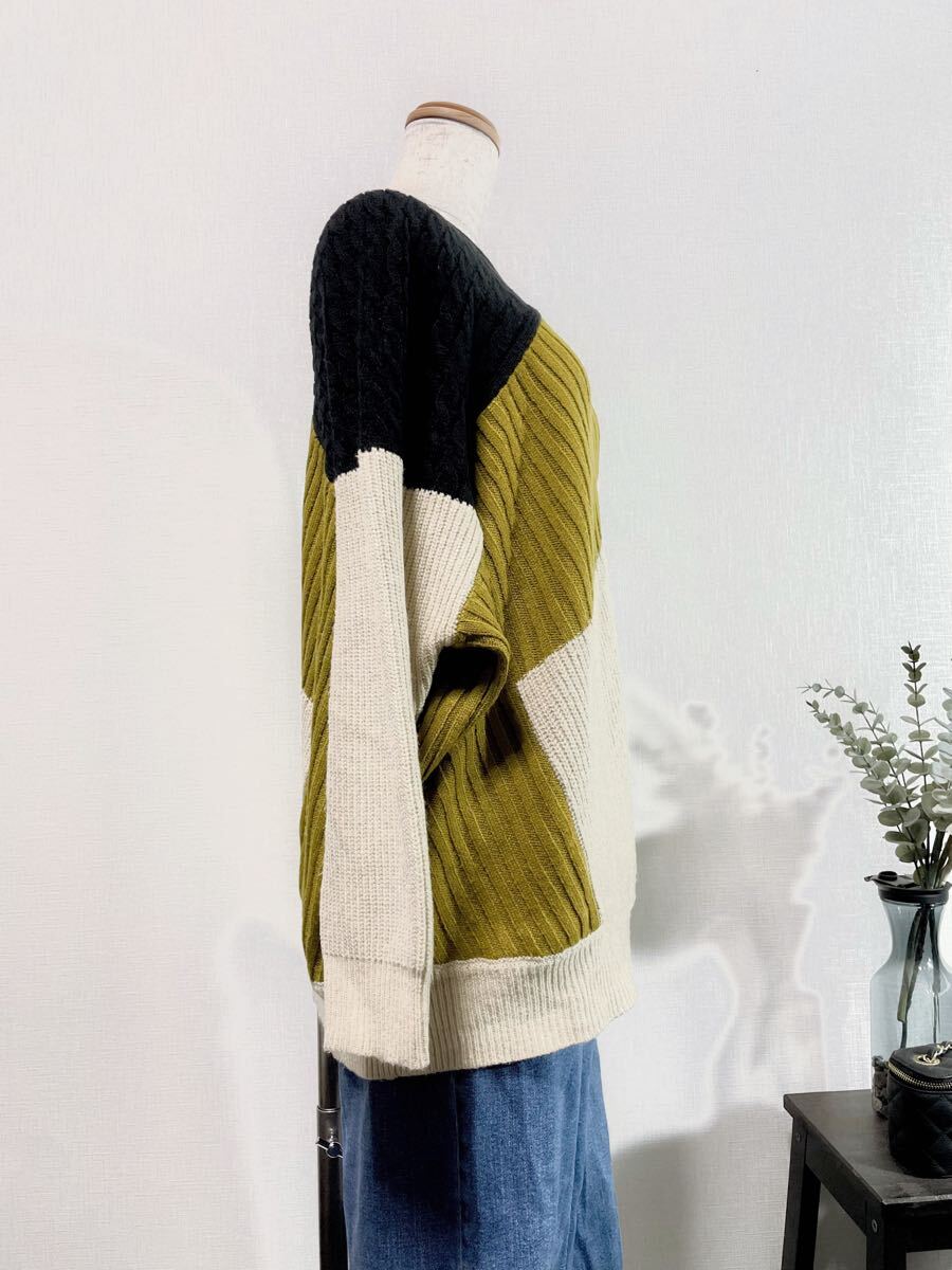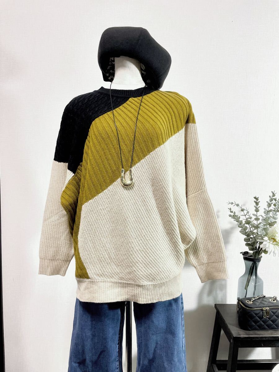 オズモーシス バイカラーゆったり大きめリブ編みニットアシンメトリー ベージュブラック