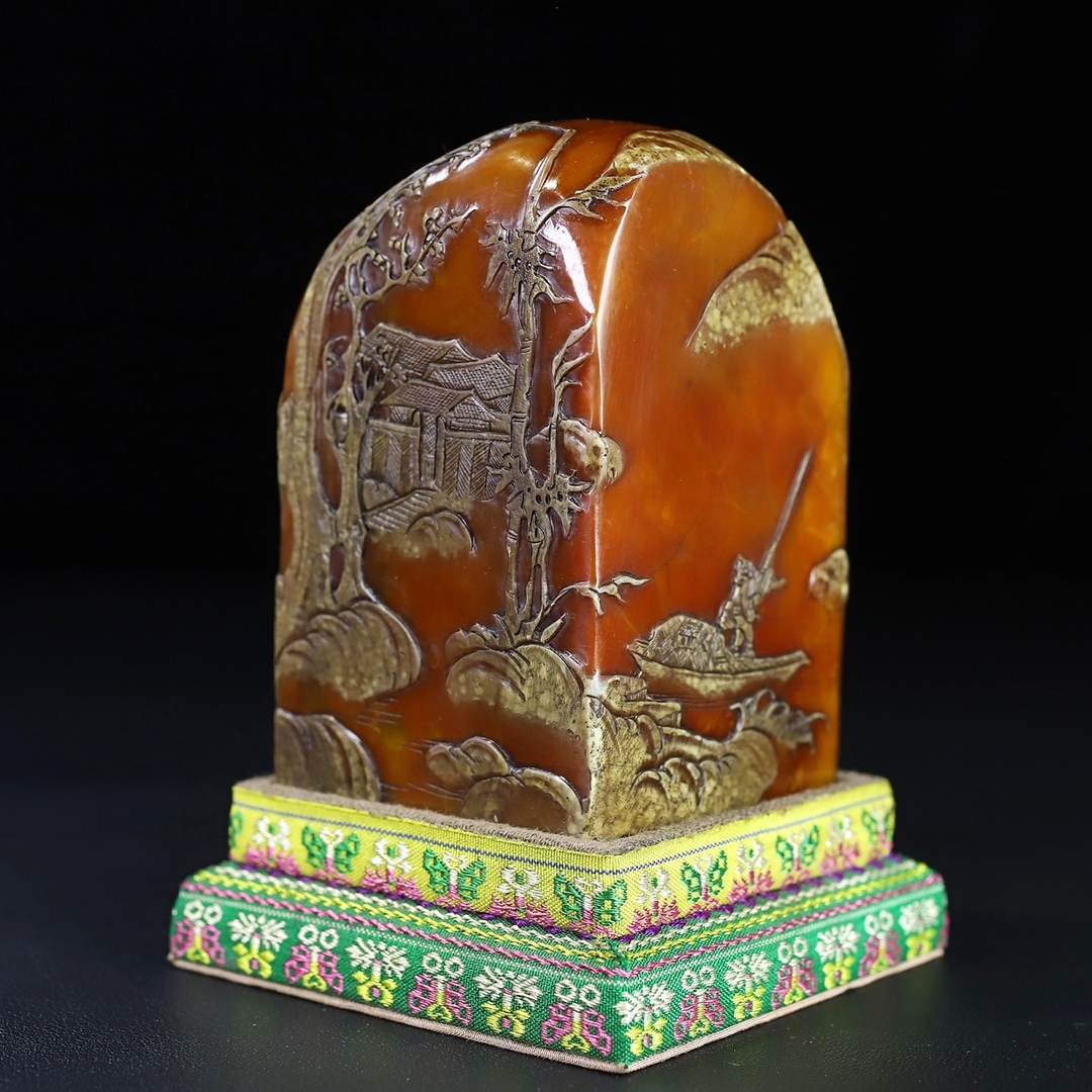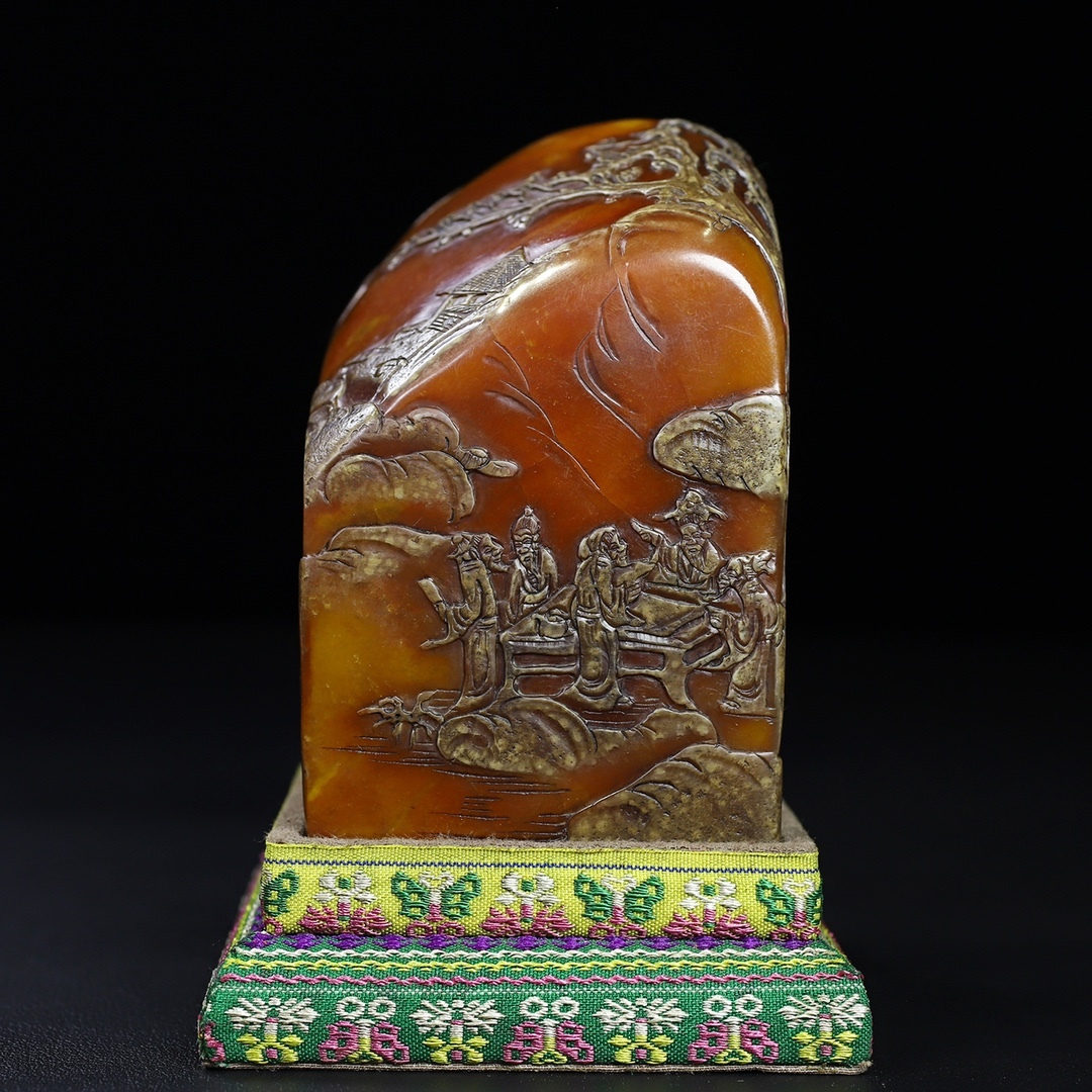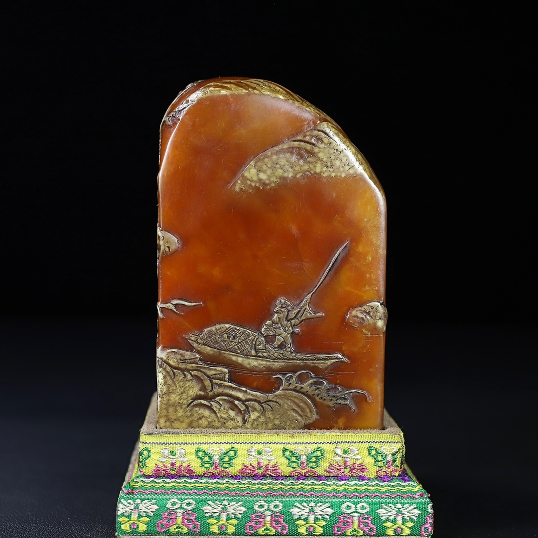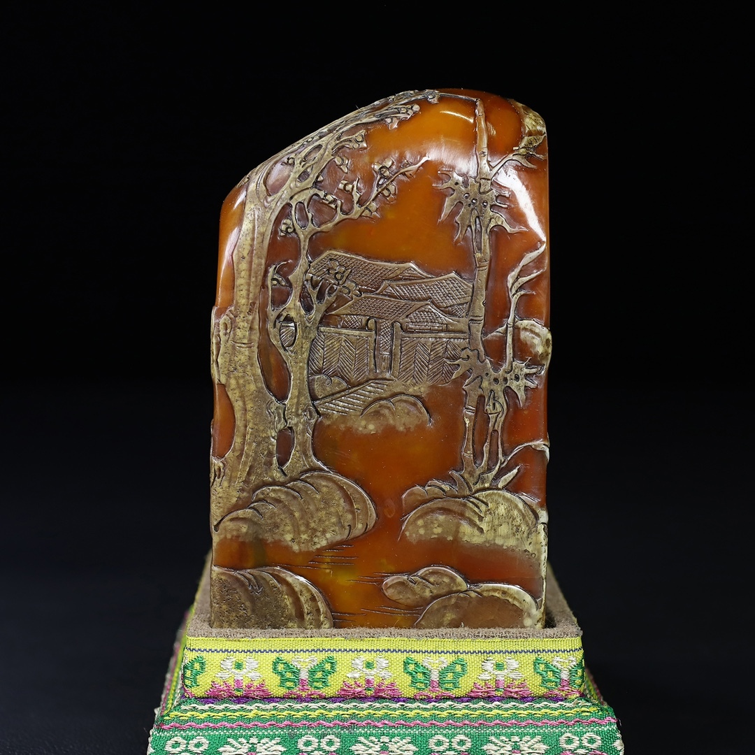 唐物 【清代篆刻家 呉昌碩 呉俊】寿山石 田黄微彫 山水人物 薄意印鑑 天然石 手彫 篆刻 古印材 極細工 中国古玩 骨董品 古美味 D610