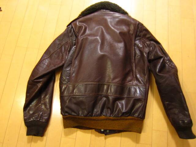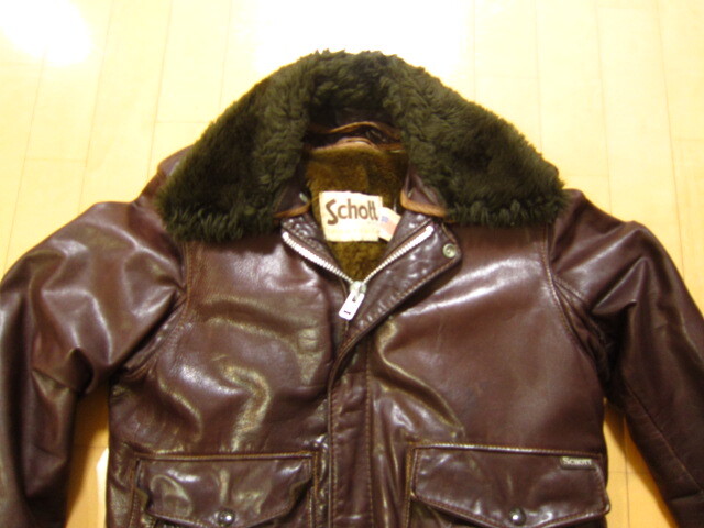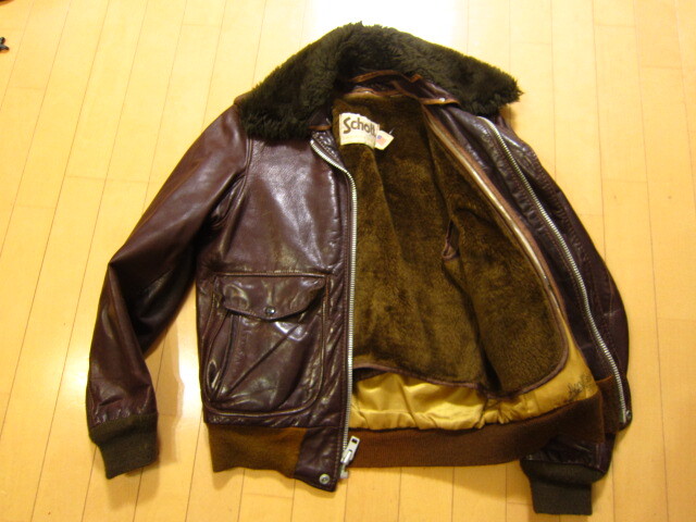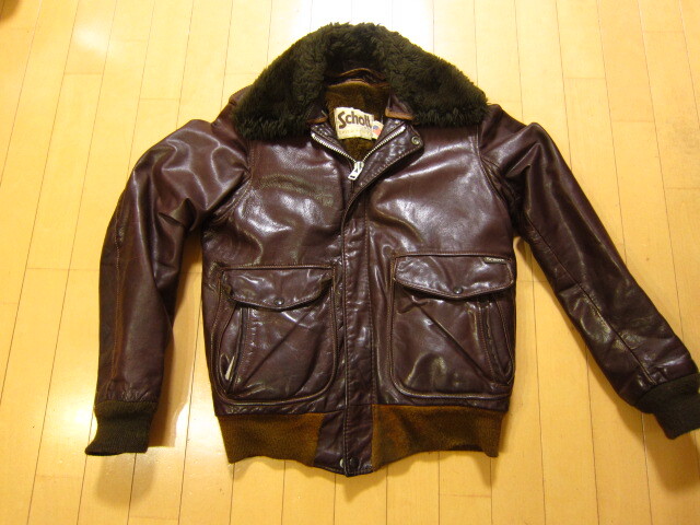 定番のSchottのG-1 レザージャケット フライトジャケットです。かっこいいです!インナーフリースタイプです。Schottの革質は良く、一生ものです。色はこげ茶です。サイズ36で、MまたはS相当だと思います。実寸より判断下さい。肩幅約43cm、袖丈約66cm、着丈約62.5cm、身幅約51cmです。中古品にしては、すれ等も少なく、状態は良いと思いますが、神経質な方は入札をお控えください。ノークレーム ・ノーリターンでお願いします。発送はヤフネコパックを予定しています。