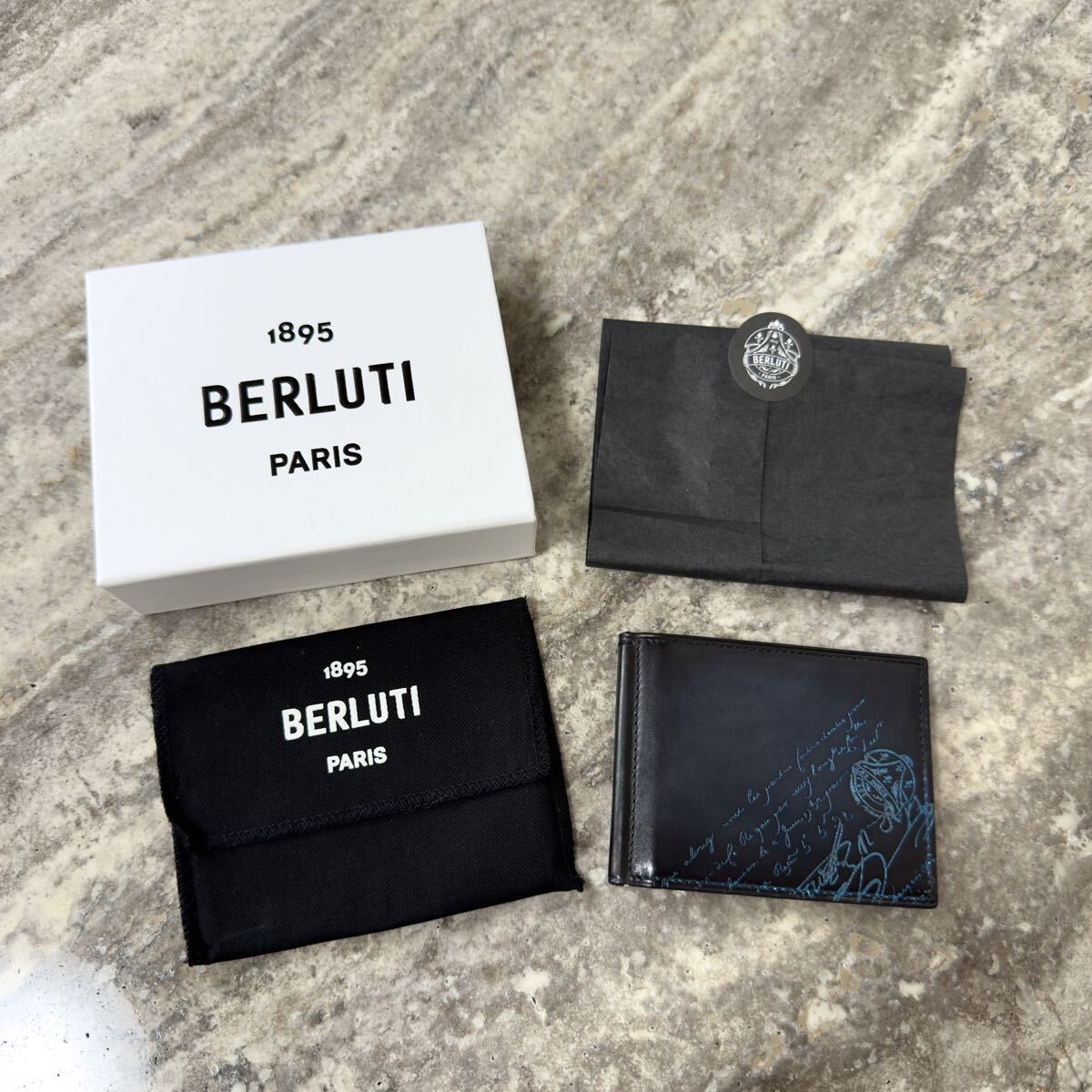 ベルルッティ純正の化粧箱と保存袋、カリグラフィースクリット柄の包み紙が付属します。